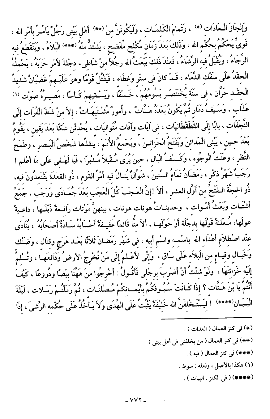وَإنْجَازَ الْعَادَاتِ (*)، وَتَمامَ الْكَلِمَاتِ، وَلَيَكُونَنَّ مِنْ (* *) أَهْلِ بَيْتِى رَجُلٌ يَأمُرُ بِأَمْرِ الله، قَوىٌّ يَحْكُمُ بِحُكْمِ الله، وَذَلِكَ بَعْدَ زَمَانٍ مُكْلِح مُفْضِحٍ، يَشْتدُّ مِنْهُ (* * *) الْبَلاَءُ، وَيَنْقَطِعُ فِيهِ الرَّجَاءُ، وَيُقْبَلُ فِيهِ الرِّشَاءُ، فَعِنْدَ ذَلِكَ يَبْعَثُ الله رجُلًا مِنْ شَاطِئ دِجْلةَ لأَمْرٍ حَزَبَهُ، يَحْمِلُهُ الْحقْدُ عَلَى سَفْكِ الدِّمَاءِ، قَدْ كانَ فِى سِتْرٍ وَغِطَاءٍ، فَيَقْتُلُ قَوْمًا وهوَ عَلَيْهِمْ غَضْبَانٌ شَدِيدُ الْحِقْدِ حَرَّان، فِى سَنَةِ بُخْتَنَصّر يَسُومُهُمْ، خَسْفًا، وَيَسْقِيهِمْ كَأسًا، مَصِيرُهُ صَوْتَ (¬1) عَذَابٍ، وَسَيْفُ دَمَارٍ ثُمَّ يَكُونُ بَعْدَهُ هَنَّاتٌ، وأُمورٌ مُشْتَبِهَاتٌ، إِلاَ مِنْ شَطّ الْفُرَاتِ إِلَى النَّجَفَاتِ، بابًا إِلَى القَطَقْطَانِيّاتِ، فِى آيَاتٍ وآفَاتٍ مُتَوالِيَاتٍ، يُحْدِثْن شَكّا بَعْدَ يَقِينٍ، يَقُومُ بَعْدَ حِينٍ، يَبْنِى الْمَدائِنَ وَيَفْتَحُ الْخَزائِنَ، ويَجْمعُ الأُمَمَ، ينقذُها شَخْصُ الْبَصرِ، وطَمَحُ النَّظرِ، وعَنَتُ الْوجُوهِ، وَكَسْفُ الْبَالِ، حِينَ يُرَى مُقْبلاَ مُدْبرًا، فَيَا لَهْفِى عَلى مَا أَعْلم! رَجَبٌ شَهْرُ ذِكْرٍ، رَمَضَانُ تَمَامُ السِّنينَ، شَوَّالٌ يُشالُ فيه أَمْرُ القَومِ، ذُو القعْدَةِ يَقْتَعِدُونَ فِيهِ، ذُو الحِجَّةَ الفَتْحُ مِنْ أَوَّلِ العشرِ، أَلاَ! إِنَّ الْعَجَبَ كُلّ الْعَجَبِ بَعْدَ جُمَادَى وَرَجَبٍ، جَمْعُ أَشْتَاتٍ وَبَعْثُ أَمْواتٍ، وحديثاتُ هوناتٍ هوناتٍ، بينهنَّ مَوْتات رَافِعةً ذَيْلَها، داعِيةً عولَها، مُعْلنةً قَوْلَها بِدِجْلَة أَوْ حَوْلَها، أَلاَ مِنَّا قَائِمًا عَفِيفَةً أَحْسَاُبهُ سَادَةٌ أَصْحَابُهُ، يُنَادَى عِنْد اصْطِلاَمِ أَعْدَاءِ الله باسْمِهِ واسْمِ أَبِيه، فِى شَهْر رَمَضانَ ثَلاَثًا بَعْد هَرْجٍ وقِتَالٍ، وَضَنْكٍ وَخَبالٍ وقِيامٍ مِن الَبلاَءِ عَلَى سَاقٍ، وَإِنِّى لأَعْلمُ إِلَى مَنْ تُخْرِجُ الأرضُ وَدَائِعَها، وتُسْلِمُ إِلَيْهِ خَزائِنَهَا، ولَوْ شِئْتُ أَنْ أَضْرِبَ بِرِجْلِى فَأَقُولُ: أَخْرِجُوا مِنَ هَاهُنَا بِيْضًا ودُروعًا، كَيْفَ أَنْتُمُ يَا بْنَ هَنَّات؟ إِذَا كانَتْ سُيُوفَكُمُ بأيْمانِكُمْ مُصْلتَاتٍ، ثُمَّ رَمَلْتُمْ رَمَلات، لَيْلَةَ الْبَيَانِ (* * * *)! لِيَسْتَخْلِفَنَّ الله خَلِيْفَةً يَثْبُتُ عَلَى الْهُدَى وَلاَ يَأخُذُ عَلَى حُكْمِهِ الرِّشىَ، إِذَا