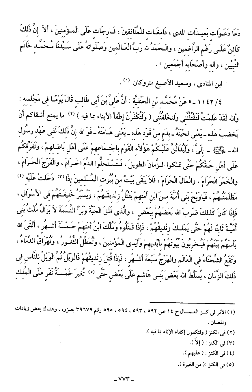 4/ 1142 - "عَنْ مُحَمَّد بْنِ الْحَنَفِيَّةِ: أَنَّ عَلِىَّ بْنَ أَبِى طَالِبٍ قَالَ يَوْمًا فِى مَجْلِسِهِ: وَالله لَقَد عَلِمْتُ لَتَقْتُلُنَّنِى وَلتخْلفُنَّنِى (وَلَتُكْفَرُنّ إِطْفأَ الأبناء بما فيه) (¬2) ما يمنع أَشقاكم أَنْ يَخضبَ هذِهِ - يَعْنِى لِحْيَتَهُ - بِدَمٍ مِنْ قَوَدِ هذِهِ - يَعْنِى هَامَتَهُ - فَوَ الله إِنَّ ذَلِكَ لَفِى عَهْدِ رسولِ الله - صلى الله عليه وسلم - إِلَىَّ، وَلَيُدَالُنَّ عَلَيْكُم هؤُلاَءِ الْقَوْم بِاجْتِمَاعِهِمْ عَلَى أَهْلِ بَاطِلِهِمْ، وَتَفَرِّقِكُم عَلَى أَهْلِ حَقِّكُمْ حَتَّى تملكوا الزَّمانَ الطويلَ، فَتَسْتَحِلُّوا الدَّمَ الحَرَامَ، والْفَرْجَ الْحَرَامَ، والْخَفرَ الْحَرَامَ، والْمَالَ الْحَرَامَ، فَلاَ يَبْقَى بَيْتٌ مِنْ بُيُوتِ الْمُسْلِمينَ إِذَا (¬3) دَخَلتْ عَلَيْهِ (¬4) مَظْلَمَتُهُمْ، فَيَا وَيْحَ بَنِى أُمَيَّةَ مِنَ ابْنِ أَمَتِهمْ يَقْتُلُ زِنْدِيقَهُمْ، وَيُسيِّرُ خَلِيفَتَهُمْ فِى الأَسْوَاقِ، فَإِذَا كَانَ كَذلِكَ ضَربَ الله بَعضَهُم بِبَعْضٍ، والَّذِى فَلَقَ الْحَبَّةَ وَبَرَأَ النَّسَمَةَ لاَ يَزَالُ مُلكُ بَنِى أُمَيَّةَ ثَابِتًا لَهُمْ حَتَّى يَمْلِكَ زِنْدِيقُهُمْ، فَإِذَا قَتَلُوهُ وَمُلِّكَ ابْنُ أَمَتِهِمْ خَمْسَةَ أَشهُرٍ، أَلْقَىَ الله بَأَسَهُمْ بَيْنَهُمْ فَيُخْرِبُونَ بُيُوتَهُمْ بأيْدِيهِمْ وَأَيْدِى الْمُؤْمِنِينَ، وَتُعَطَّلُ الثُّغُورُ، وَتُهْرَاقُ الدِّمَاءُ، وَتَقَعُ الشَّحْنَاءُ فِى الْعَالَمِ والْهَرْجُ سَبْعَةَ أَشْهُرٍ، فَإِذَا قُتِلَ زِنْدِيقُهُمْ فَالْوَيْلُ ثُمَّ الْوَيْلُ لِلنَّاسِ فِى ذَلِكَ الزَّمَانِ، يُسَلِّطُ الله بَعْضَ بَنِى هَاشِمٍ عَلَى بَعْضٍ حَتَّى (¬5) تُغيرَ خَمْسَةُ نَفَرٍ عَلَى الْمُلِكِ
