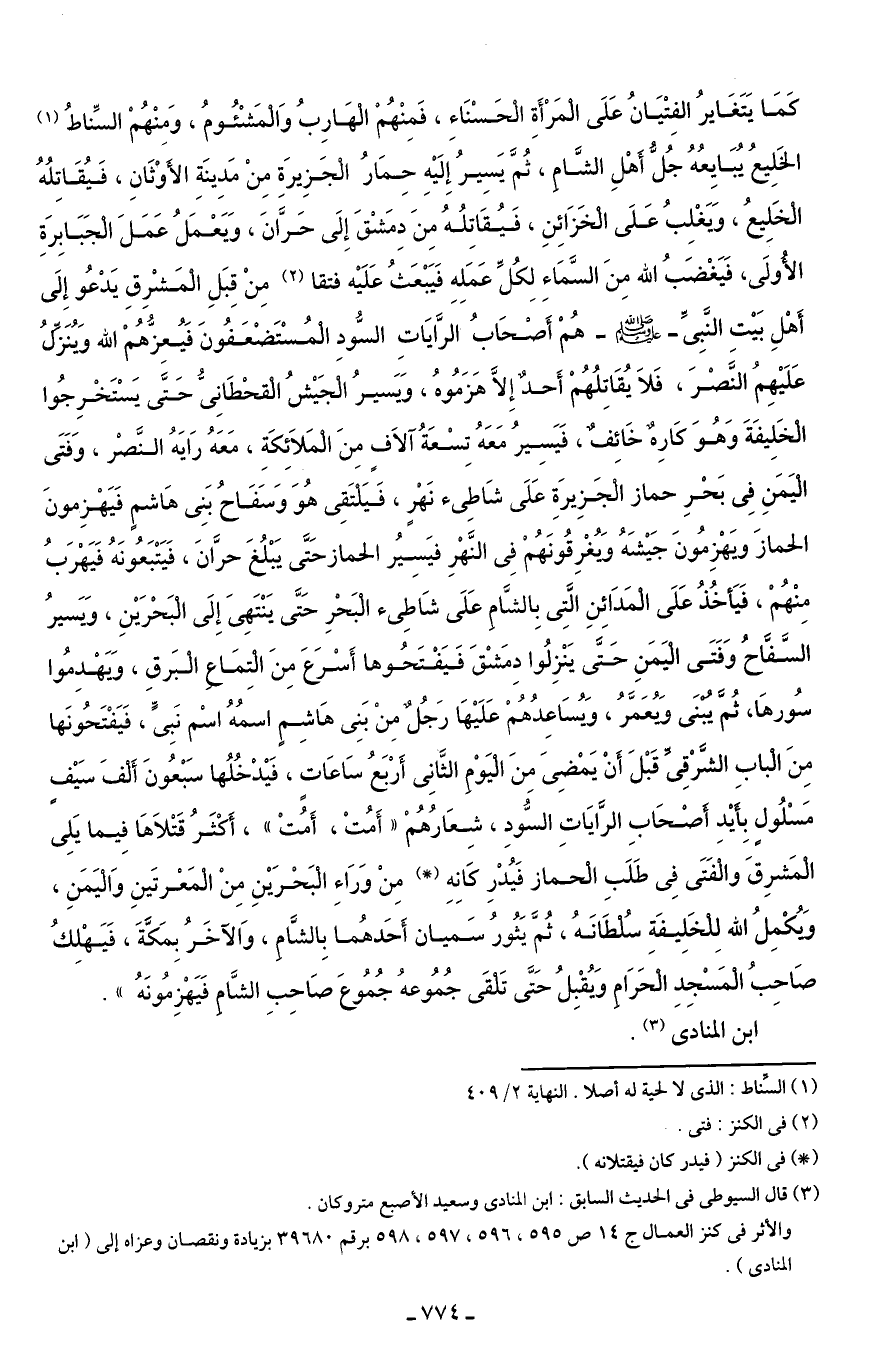 كَمَا يَتَغَايرُ الفِتْيَانُ عَلَى الْمَرْأَةِ الْحَسْنَاءِ، فَمِنْهُمْ الْهَارِبُ وَالْمَشْئُومُ، وَمِنْهُمْ السِّناطُ (¬1) الخَلِيعُ يُبَايِعُهُ جُلُّ أَهْلِ الشَّامِ، ثُمَّ يَسِيرُ إِلَيْهِ حِمَارُ الْجَزِيرَة مِنْ مَدِينَةِ الأَوْثَانِ، فَيُقَاتِلُهُ الْخَلِيعُ، وَيَغْلِبُ عَلَى الْخَزَائِنِ، فَيُقَاتِلُهُ مِنَ دِمَشْقَ إِلَى حَرَّانَ، وَيَعْمَلُ عَمَلَ الْجَبَابِرَةِ الأولَى، فَيَغْضَبُ الله مِنَ السَّمَاءِ لِكُلِّ عَمَلِهِ فَيَبْعَت عَلَيْه فتقا (¬2) مِنْ قِبَلِ الْمَشْرِقِ يَدعُو إِلَى أَهْلِ بَيْت النَّبِىِّ - صلى الله عليه وسلم - هُم أَصْحَابُ الرَّايَاتِ السُّودِ الْمُسْتَضْعَفُونَ فَيُعِزُّهُمْ الله وَيُنَزِّلُ عَلَيْهِمُ النَّصْرَ، فَلاَ يُقَاتِلُهُمْ أَحدٌ إِلاَّ هَزَمُوهُ، وَيَسيرُ الْجَيْشُ الْقحْطَانِى حَتَّى يَسْتَخْرِجُوا الْخَلِيفَةَ وَهُوَ كَارِهٌ خَائِفٌ، فَيَسِيرُ مَعَهُ تِسْعَةُ آلاَف مِنَ الْمَلاَئِكَةِ، مَعَهُ رَايَةُ النَّصْر، وَفَتَى الْيَمَنِ فِى بَحْرِ حماز الْجَزِيرَةِ عَلَى شَاطِئ نَهْرٍ، فَيَلتَقِى هُوَ وَسَفَاحُ بَنِى هَاشمٍ فَيَهْزِمونَ الحمازَ ويَهْزِمُونَ جَيْشَهُ وَيُغْرِقُونَهُمْ فِى النَّهْرِ فيَسِيُر الحماز حَتَّى يَبْلُغَ حرَّانَ، فَيَتْبَعُونَهُ فَيَهْرَبُ مِنْهُم، فَيَأخُذُ عَلَى الْمَدَائِنِ الَّتِى بِالشَّامِ عَلَى شَاطِئ الْبَحْرِ حَتَّى يَنْتَهِىَ إِلَى الْبَحْرَيْنِ، وَيَسيرُ السَّفَاحُ وَفَتَى الْيَمَنِ حَتَّى يَنْزِلُوا دِمَشْقَ فَيَفْتَحُوها أَسْرعَ مِنَ الْتِمَاعِ الْبَرقِ، وَيَهْدِمُوا سُورهَا، ثُمَّ يُبْنَى وَيُعَمَّرُ، وَيُسَاعِدُهُمْ عَلَيْهَا رَجُلٌ مِنْ بَنِى هَاشِمٍ اسمُهُ اسْم نَبِىٍّ، فَيَفْتَحُونَها مِنَ الْبابِ الشَّرْقِى قَبْلَ أنْ يَمْضِىَ مِنَ الْيَوْمِ الثَّانِى أَرْبَعُ سَاعَات، فَيْدْخُلُها سَبْعُونَ أَلْفَ سَيْفٍ مَسْلُول بِأَيْدِ أَصْحَابِ الرَّايَاتِ السُّودِ، شِعَارهُمْ "أَمُتْ، أَمُتْ"، أَكْثَرُ قَتْلاَهَا فِيما يَلِى الْمَشرِقَ والْفَتَى فِى طَلَبِ الْحماز فَيُدْرِكَانِهِ (*) مِنْ وَرَاءِ الْبَحْرَيْنِ مِنْ الْمَعْرتَينِ وَالْيَمَنِ، وَيُكْمِلُ الله لِلْخَلِيفَةِ سُلطَانَهُ، ثُمَّ يَثُورُ سَميان أَحَدهُما بِالشَّام، وَالآخَرُ بِمَكَّةَ، فَيَهْلِكُ صَاحِبُ الْمَسْجِدِ الْحَرَامِ وَيُقْبِلُ حَتَّى تَلْقَى جُمُوعهُ جُمُوعَ صَاحِبِ الشَّامِ فَيَهْزمُونَهُ".