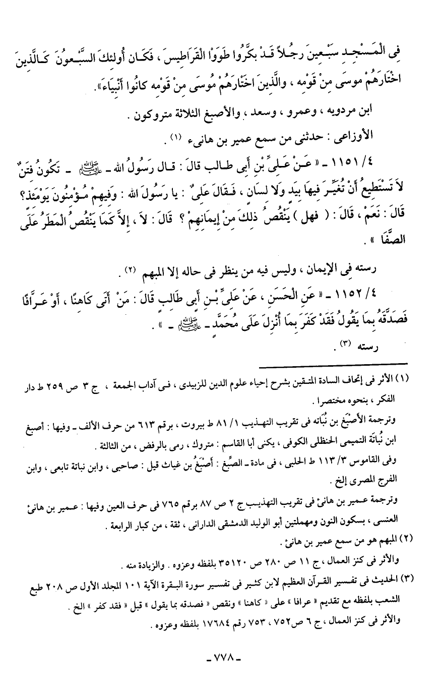 4/ 1151 - "عَنْ عَلِىِّ بْنِ أَبِى طالب قالَ: قال رَسُولُ الله - صلى الله عليه وسلم - تَكُونُ فِتَنٌ لاَ تَسْتَطِيعُ أَنْ تُغيَرَ فِيها بِيَد وَلا لِسَانٍ، فَقَالَ عَلِىٌّ: يا رَسُولَ الله: وَفِيهِمْ مُؤْمِنُونَ يَوْمَئِذ؟ قَالَ: نَعَم، قَالَ: (فهل) يَنْقُصُ ذلِكَ مِنْ إِيمَانهِمْ؟ قَالَ: لاَ، إلاَّ كَمَا يَنْقُصُ الْمَطَرُ عَلَى الصَّفَا".