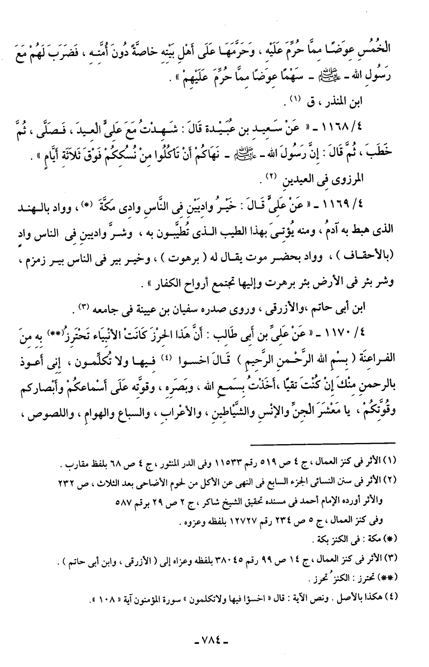 (¬2) الأثر في سنن النسائى الجزء السابع في النهي عن الأكل من لحوم الأضاحى بعد الثلاث، ص 232 والأثر أورده الإمام أحمد في مسنده تحقيق الشيخ شاكر، ج 2 ص 29 برقم 587 وفى كنز العمال، ج 5 ص 234 رقم 12727 بلفظه وعزوه.