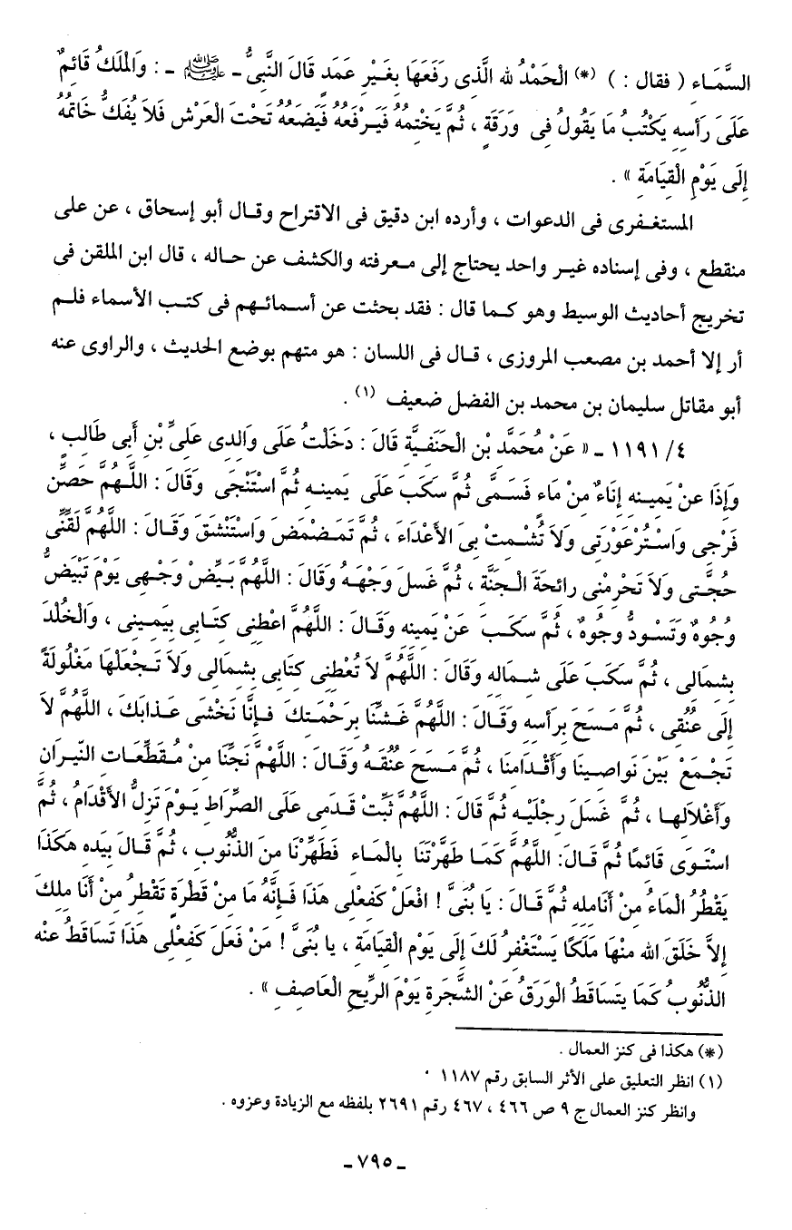 4/ 1191 - "عَنْ مُحَمَّدِ بْن الْحَنَفيَّةِ قَالَ: دَخَلْتُ عَلَى وَالِدِى عَلِىِّ بْنِ أَبى طَالِب، وَإِذَا عنْ يَمِينهِ إِنَاءٌ مِنْ مَاء فَسَمَّى ثُمَّ سَكَبً عَلَى يَمينهِ ثُمَّ اسْتَنْجَى وَقَالَ: اللَّهُمَّ حَصِّن فَرْجى وَاسْتُرْ عَوْرَتِى وَلاَ تُشْمِتْ بِىَ الأَعْدَاءَ، ثُمَّ تَمَضْمَضَ وَاسْتَنْشَقَ وَقَالَ: اللَّهُمَّ لَقِّنِّى حُجَّتى وَلاَ تَحْرمْنِى رائِحَةَ الْجَنَّة، ثُمَّ غَسلَ وَجْهَهُ وَقَالَ: اللَّهُمَّ بَيِّضْ وَجْهِى يَوْمَ تَبْيَضُّ وُجُوهٌ وَتَسْودُّ وجُوهٌ، ثُمَّ سَكَبَ عَنْ يَمِينهِ وَقَالَ: اللَّهُمَّ اعْطِنِى كِتَابِى بِيَميِنى، وَالْخُلْدَ بِشِمَالِى، ثُمَّ سَكَبَ عَلَى شِمَالِهِ وَقَالَ: اللَّهُمَّ لاَ تُعْطِنِى كتَابِى بشِمَالِى وَلاَ تَجْعَلْهَا مَغْلُولَةً إِلَى عُنُقِى، ثُمَّ مَسَحَ بِرَأسِهِ وَقَالَ: اللَّهُمَّ غَشِّنَا بِرَحْمَتِكَ فإِنَّا نَخْشَى عَذابَكَ، اللَّهُمَّ لاَ تَجْمَعْ بَيْنَ نَواصِينَا وَأَقْدَامِنَا، ثُمَّ مَسَحَ عُنُقَهُ وَقَالَ: اللَّهْمَّ نَجِّنَا مِنْ مقَطِّعَات النّيرَانِ وَأَغْلاَلِها، ثُمَّ غَسَلَ رِجْلَيْه ثُمَّ قَالَ: اللَّهُمَّ ثبِّتْ قَدَمِى عَلَى الصِّرَاطِ يَوْمَ تَزِلُّ الأَقدَامُ، ثُمَّ اسْتَوَى قَائمًا ثُمَّ قَالَ: اللَّهُمًّ كَمَا طَهَّرْتَنَا بِالْمَاءِ فَطَهِّرْنَا منَ الذُّنُوب، ثُمَّ قَالَ بِيَدهِ هَكَذَا يَقْطُرُ الْمَاءُ مِنْ أَنَامِلِه ثُمَّ قَالَ: يَا بُنَىَّ! افْعَلْ كَفِعْلِى هَذَا فَإِنَّهُ مَا مِنْ قَطْرَة تَقْطِرُ مِنْ أَنَا مِلِكَ إِلاَّ خَلَقَ الله منْهَا مَلَكًا يَسْتَغْفِرُ لَكَ إِلَى يَوْم القِيَامَةِ، يا بُنَىَّ! مَنْ فَعَلَ كفِعْلِي هذَا تَسَاقَطُ عنْه الذُّنُوبُ كَمَا يتَسَاقَطُ الْوَرَقُ عَنْ الشَّجَرةِ يَوْمَ الرِّيحِ الْعَاصِفِ".