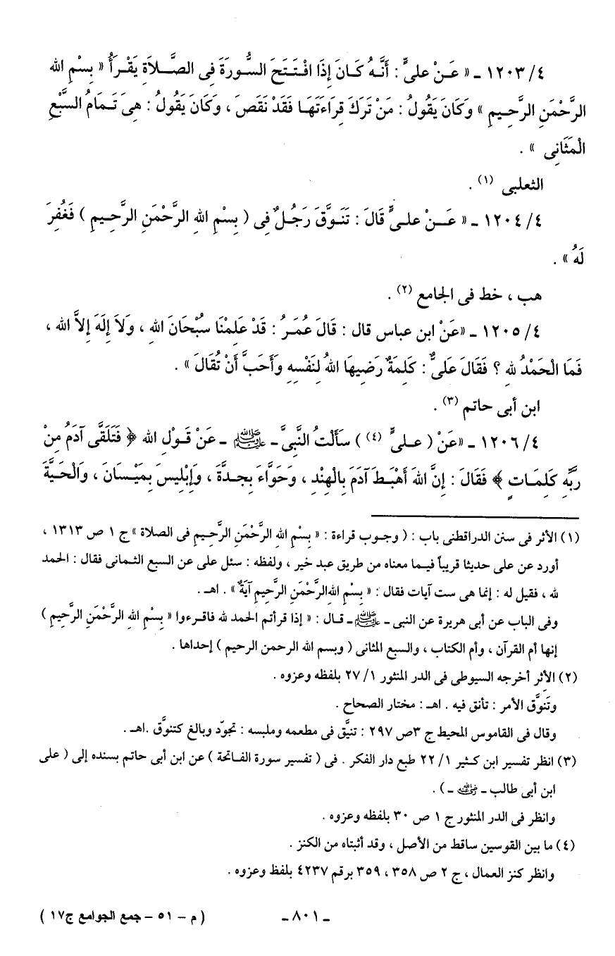 4/ 1203 - " عَنْ عليٍّ: أَنَّهُ كانَ إِذَا افْتَتَحَ السُّورَةَ فِى الصَّلاَةِ يَقْرَأُ "بِسْم الله الرَّحْمَنِ الرَّحِيم" وَكَانَ يَقُولُ: مَنْ تَرَكَ قِرَاءَتَهَا فَقَدْ نَقَصَ، وَكانَ يَقُولُ: هِىَ تَمَامُ السَّبْع المَثَانِى".
