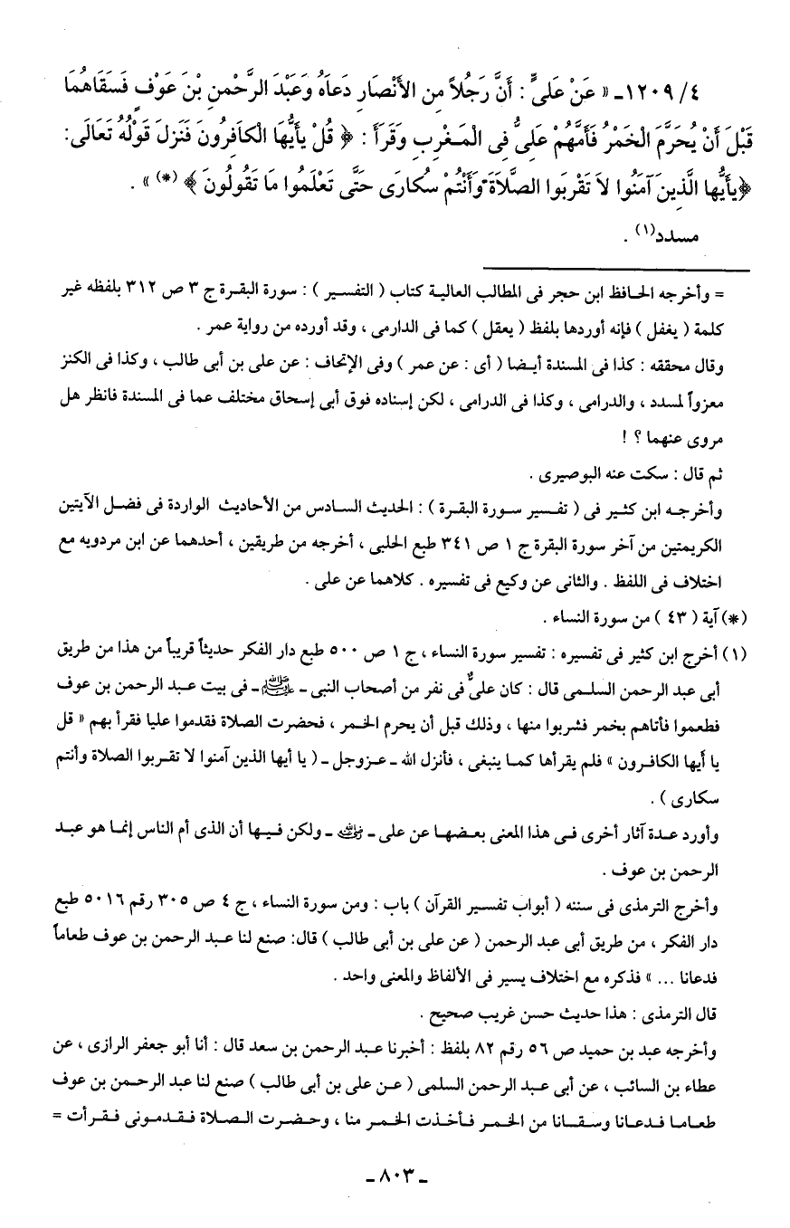 4/ 1209 - " عَنْ عَلىٍّ: أَنَّ رَجُلًا مِن الأنْصَارِ دَعاَهُ وَعَبْدَ الرَّحْمنِ بْنَ عَوْفٍ فَسَقَاهُمَا قَبْلَ أنْ يُحَرَّمَ الْخَمْرُ فَأمَّهُمْ عَلِى فِى الْمَغْرِبِ وَقَرَأَ: {قُلْ يَاأَيُّهَا الْكَافِرُونَ (1)} فَنَزلَ قَوْلُهُ تَعَالَى: {يَاأَيُّهَا الَّذِينَ آمَنُوا لَا تَقْرَبُوا الصَّلَاةَ وَأَنْتُمْ سُكَارَى حَتَّى تَعْلَمُوا مَا تَقُولُونَ} (*) ".