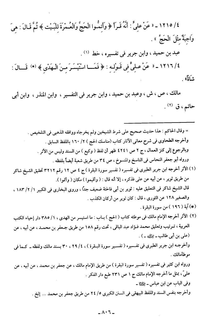 (¬2) الأثر أخرجه الإمام مالك في موطئه كتاب (الحج) باب: ما استيسر من الهدى، 1/ 385 دار إحياء الكتب العربية، ترتيب وتعليق محمد فؤاد عبد الباقى، تحت رقم 158 من طريق جعفر بن محمد، عن أبيه، عن (على بن أبى طالب - رضي الله عنه -).