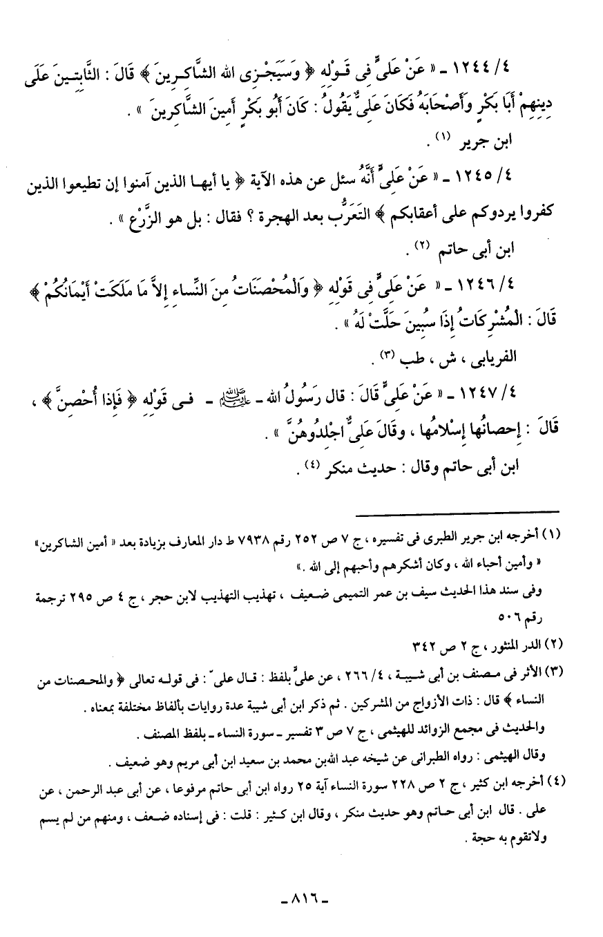 (¬3) الأثر في مصنف بن أبى شيبة، 4/ 266، عن علىٍّ بلفظ: قال على: في قوله تعالى {وَالْمُحْصَنَاتُ مِنَ النِّسَاءِ} قال: ذات الأزواج من المشركين. ثم ذكر ابن أبى شيبة عدة روايات بألفاظ مختلفة بمعناه.