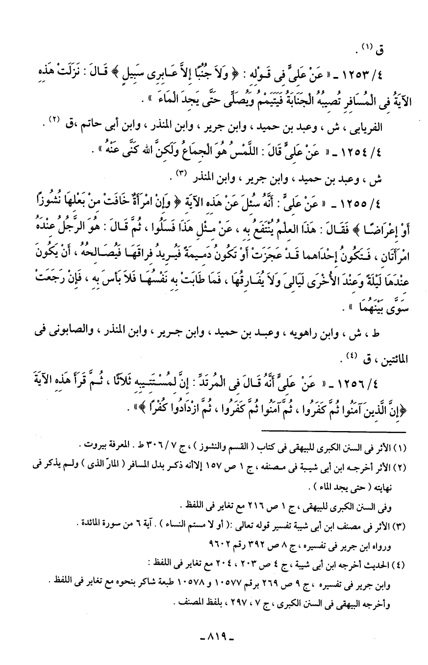 4/ 1253 - " عَنْ عَلِىٍّ فِى قَوْلِهِ: {وَلَا جُنُبًا إِلَّا عَابِرِي سَبِيلٍ} وقَالَ: نَزَلَتْ هَذِهِ الآيَةُ فِى المُسَافِرِ تُصِيبُهُ الجَنَابَةُ فَيَتَيَمْمُ وَيُصَلِّى حَتَّى يَجِدَ المَاءَ".