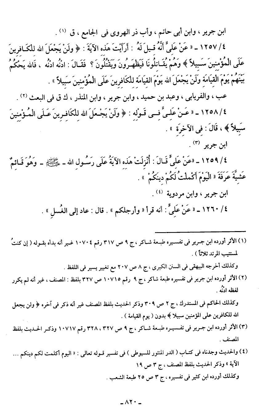 4/ 1258 - "عَنْ عَلِىٍّ فِى قَوْلِهِ: {وَلَنْ يَجْعَلَ اللَّهُ لِلْكَافِرِينَ عَلَى الْمُؤْمِنِينَ سَبِيلًا}، قَالَ: فِى الآخِرَةِ".