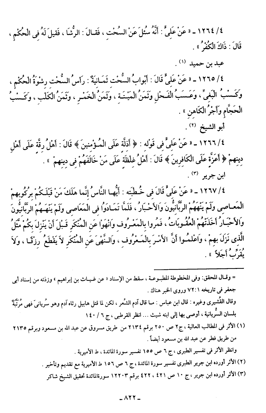 4/ 1264 - " عَنْ عَلِىٍّ: أَنَّهُ سُئلَ عَنْ السُّحْت، فَقالَ: الرُّشُا، فَقيلَ لَهُ فِى الحُكْم، قَالَ: ذَاكَ الكُفْرُ".