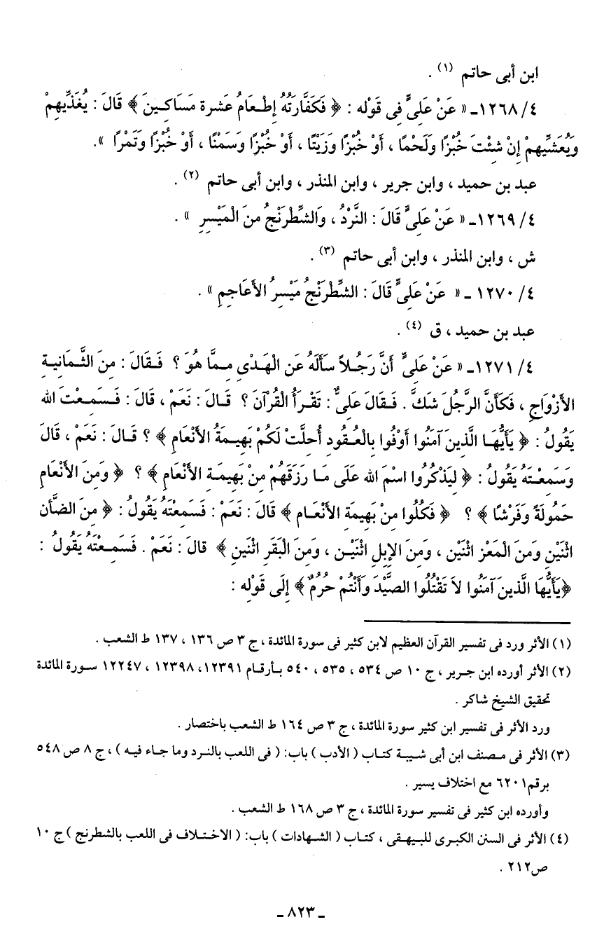 4/ 1269 - " عَنْ عَلِىٍّ قَالَ: النَّرْدُ، وَالشِّطرَنْجُ منَ المَيْسِرِ".