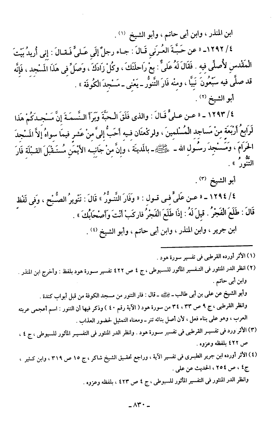 4/ 1294 - "عن عَليٍّ فِى قولِ: "وَفَارَ التَّنوُّر" قَالَ: تَنْويرُ الصُّبْح، وَفِى لَفْظٍ قَالَ: طَلَعَ الفَجْرُ. قيِلَ لَهُ: إذَا طَلَعَ الفَجْرُ فاركب أنْتَ وَأصْحَابُكَ".