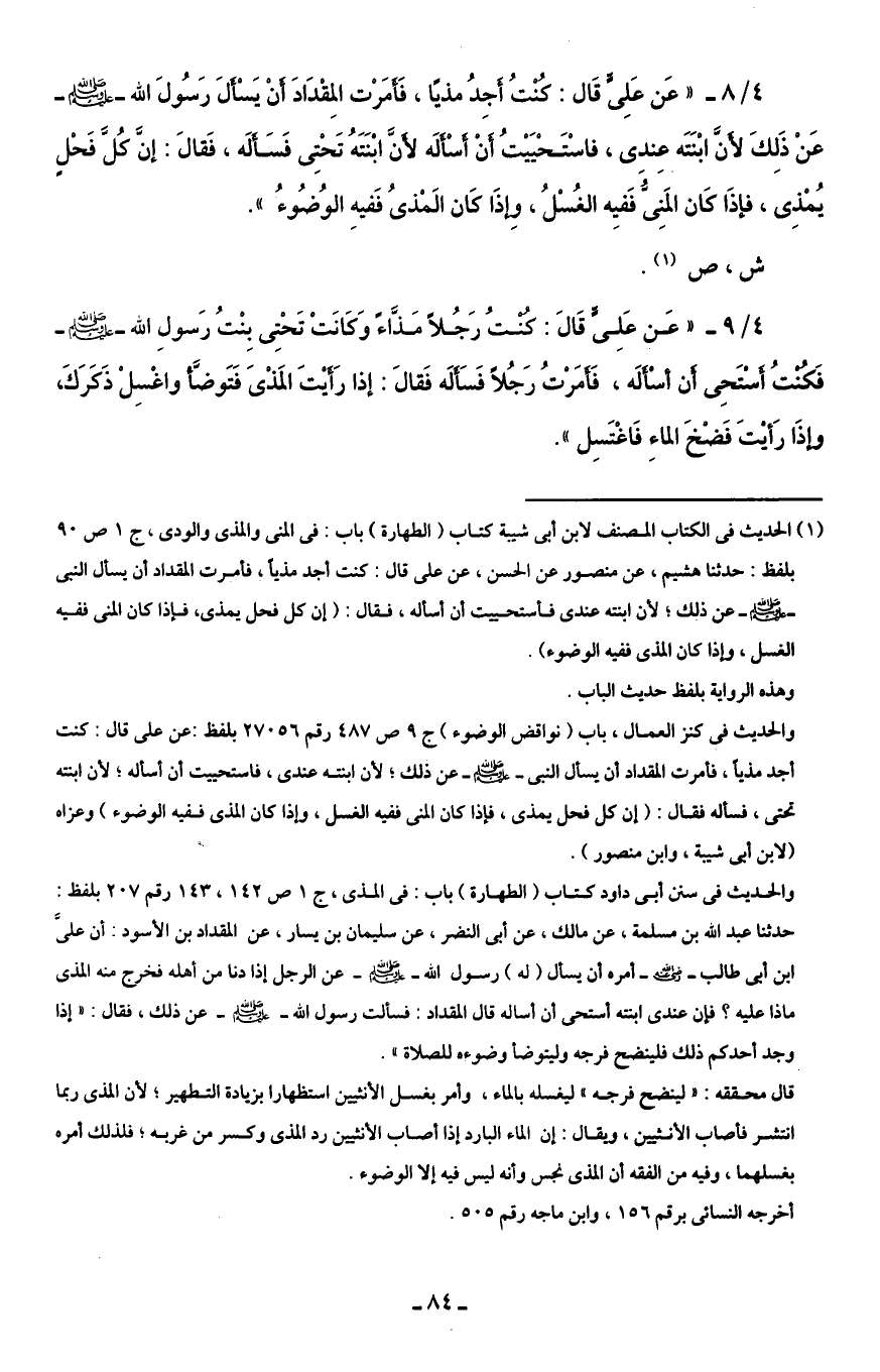 4/ 9 - "عَن عَلِيٍّ قَالَ: كنتُ رَجُلاَ مَذَّاءَ وَكانَتْ تَحْتِى بِنْتُ رَسولِ الله - صلى الله عليه وسلم - فَكنتُ أستَحِى أن أسألَه، فَأمَرْتُ رَجُلًا فَسَألَه فَقالَ: إذا رَأيْتَ المَذْىَ فَتَوضَّأ واغْسِلْ ذَكَرَكَ، وإذَا رَأيتَ فَضْخَ الماءِ فَاغْتَسِل ".