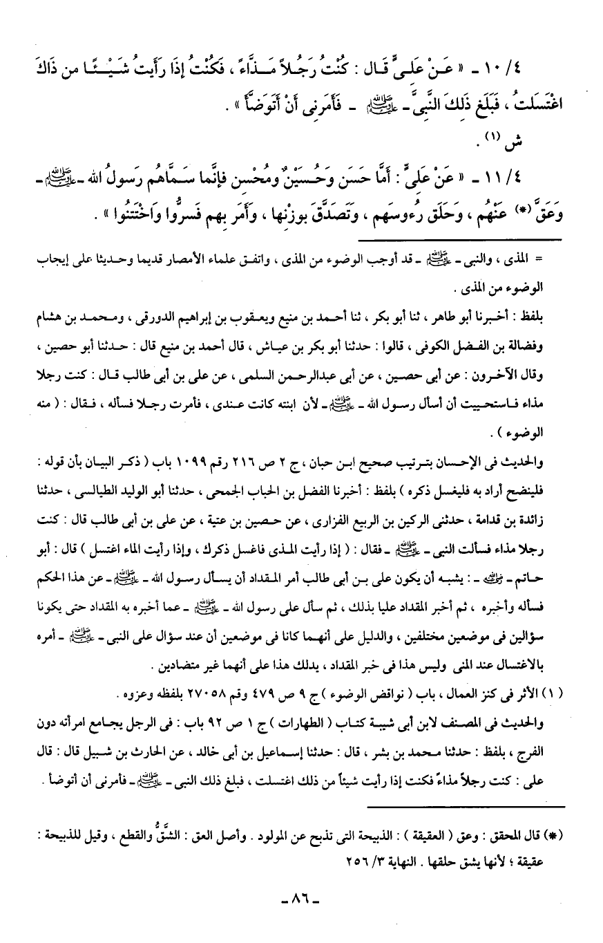 4/ 11 - "عَنْ عَلِيٍّ: أَمَّا حَسَن وَحُسَيْن ومُحْسِن فإنَّما سَمَّاهُم رَسولُ الله - صلى الله عليه وسلم - وَعَقَّ (*) عَنْهُم، وَحَلَق رُءوسَهم، وَتَصَدَّقَ بوزْنِها، وَأمَر بِهم فَسرُّوا وَاخْتَتنُوا ".