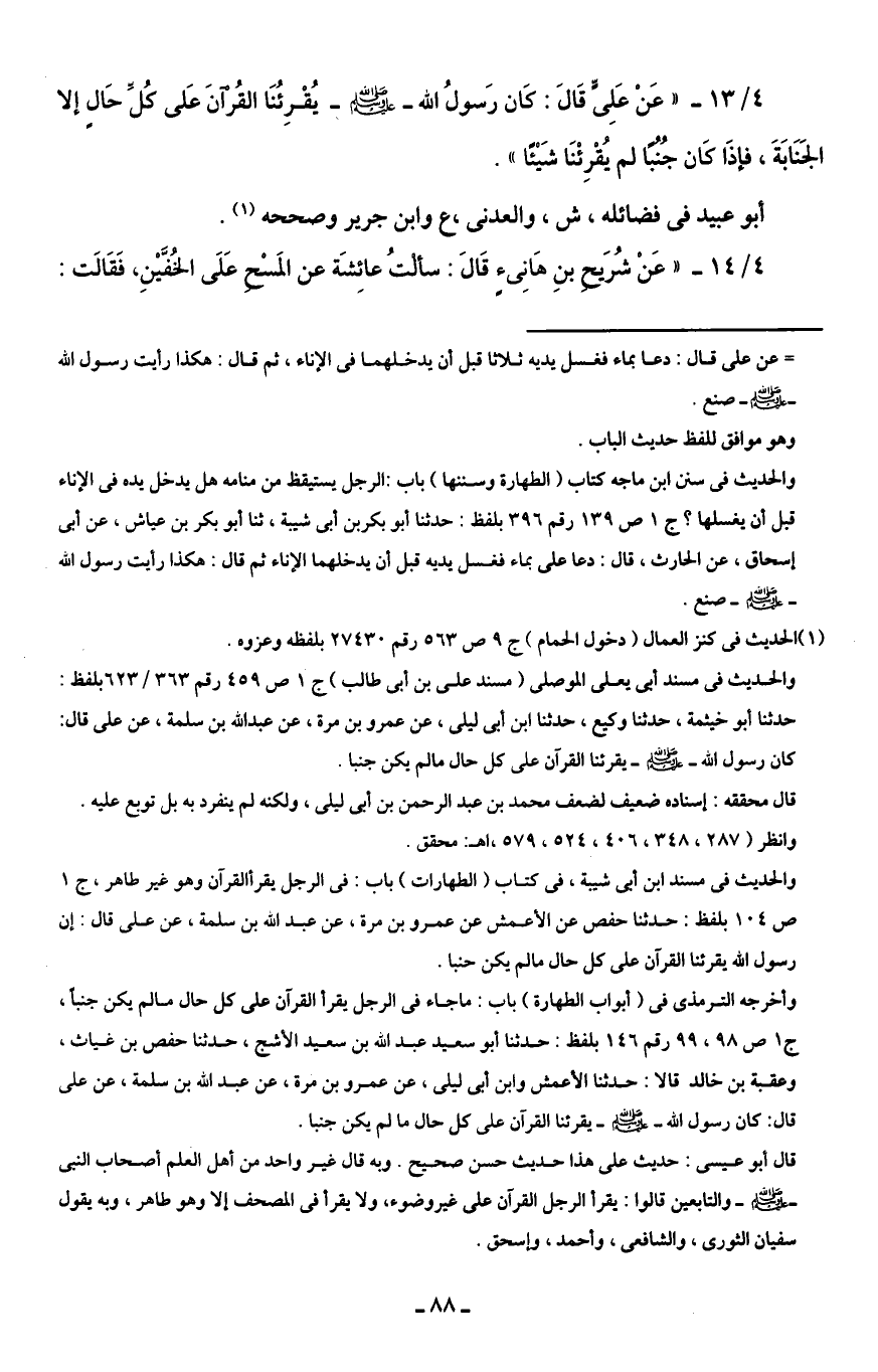 4/ 13 - " عَنْ عَلِىٍّ قَالَ: كان رَسولُ الله - صلى الله عليه وسلم - يُقْرِئُنَا القُرآنَ عَلى كُلِّ حَالٍ إلا الجَنَابَةَ، فإذَا كان جُنُبًا لم يُقْرِئْنَا شَيْئًا ".