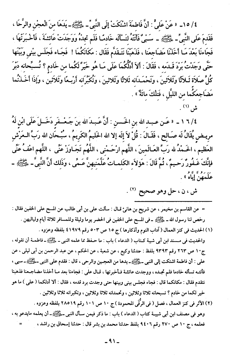 4/ 15 - " عَنْ عَلِىٍّ: أنَّ فَاطمَةَ اشْتَكَتْ إلَى النَّبِىِّ - صلى الله عليه وسلم - يَدَهَا مِنَ العجْنِ والرَّحَا، فَقَدِمَ عَلى النَّبِىِّ - صلى الله عليه وسلم - سَبْيٌ فَأَتَتْهُ لِتَسْألَه خَادِمًا فَلَم تجِدْهُ وَوَجَدَتْ عَائِشَةَ، فَأخْبَرَتْهَا، فَجَاءنَا بَعْدَ مَا أخَذْنَا مَضَاجِعَنا، فَذَهَبْنَا نَتَقَدَّم فَقَال: مَكَانَكُمَا! فَجَاء فَجَلَس بيْني وَبَيْنَها حَتَّى وَجَدْتُ بَرْدَ قَدَمِهِ، فَقَالَ: ألاَ أدُلُّكُمَا عَلَى مَا هُو خَيْر لَكُما مِن خَادِم؟ تُسبِّحانِه دَبْرَ كُلِّ صَلاَةٍ ثَلاثًا وَثَلاَثينَ، وَتَحْمَدَانِه ثَلاثًا وَثَلاثينَ، وَتُكَبِّرَانِه أَرْبعًا وَثَلاَثين، وَإذَا أخَذْتُما مَضَاجِعَكُما مِن الليَّلِ، فَتِلْكَ مِائَةٌ".