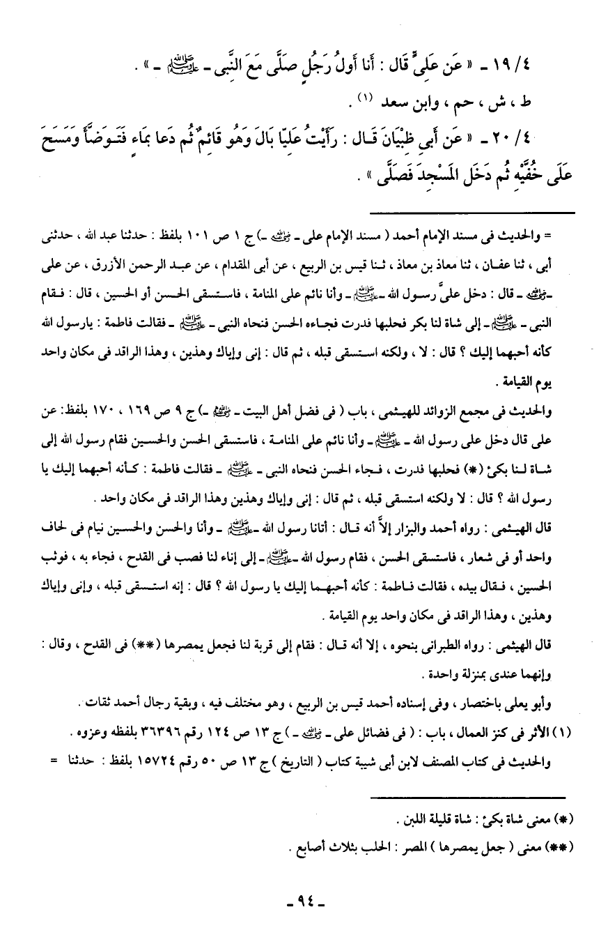 4/ 19 - " عَن عَلِىٍّ قَال: أَنا أَولُ رَجُلٍ صَلَّى مَعَ النَّبِى - صلى الله عليه وسلم - ".