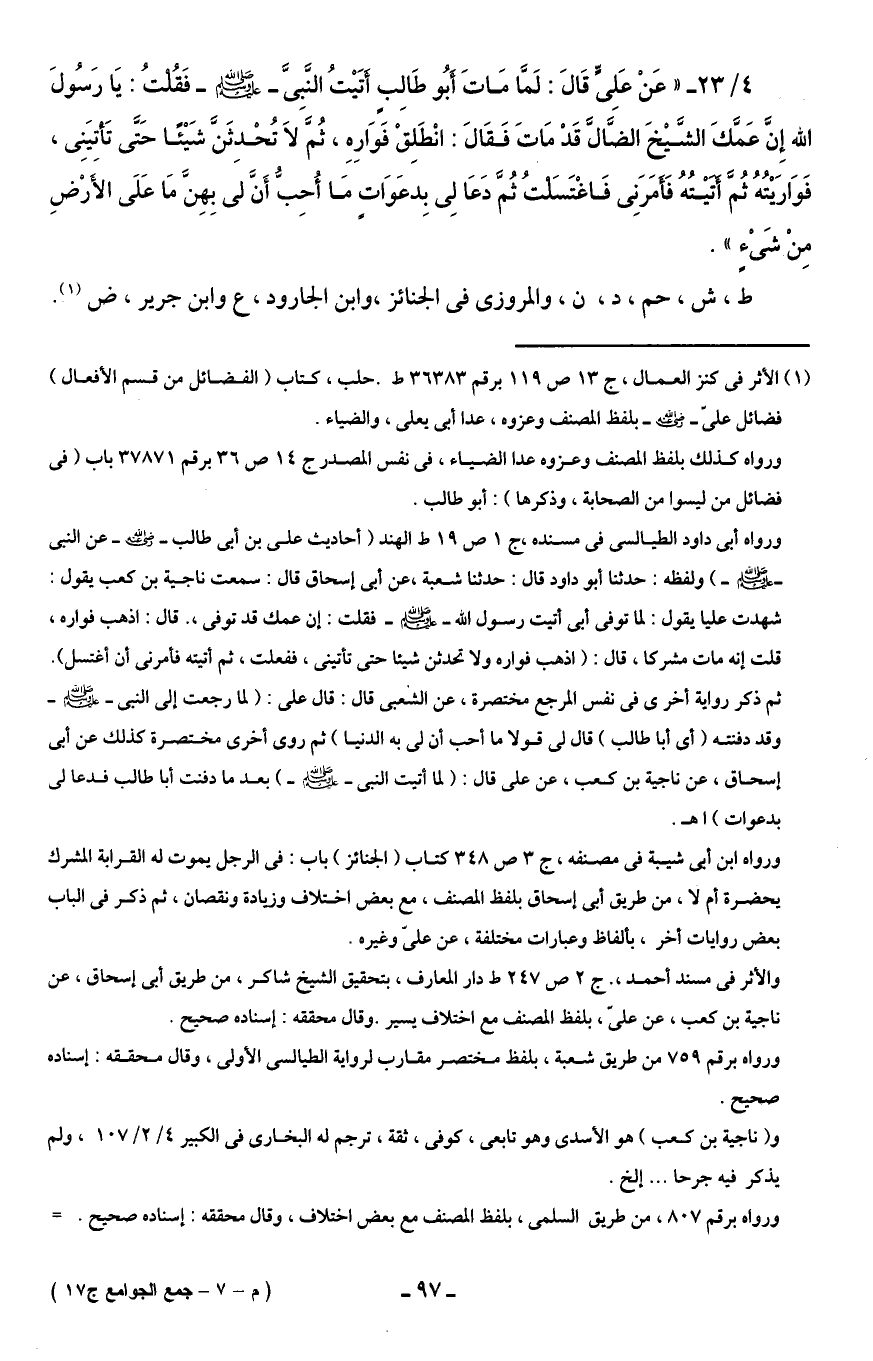 4/ 23 - " عَنْ عَلِىٍّ قَالَ: لَمَّا مَاتَ أبُو طَالِبٍ أتَيْتُ النَّبِىَّ - صلى الله عليه وسلم - فَقُلتُ: يَا رَسُولَ الله إِنَّ عَمَّكَ الشَّيْخَ الضَّالَّ قَدْ مَاتَ فَقَالَ: انْطَلِقْ فَوَارِهِ، ثُمَّ لاَ تُحْدِثَنَّ شَيْئًا حَتَّى تَأتيَنِى، فَوَارَيْتُهُ ثُمَّ أتيْتُهُ فَأَمَرَنِى فَاغْتَسَلتُ ثُمَّ دَعَا لِى بِدعَوَاتٍ مَا أُحِبُ أَنَّ لى بِهِنَّ مَا عَلَى الأَرْضِ مِنْ شَىْءٍ".
