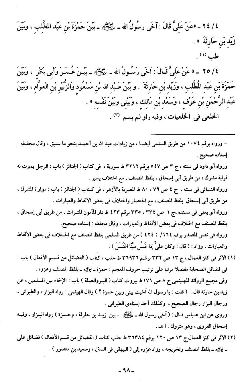 4/ 24 - "عَنْ عَلِيٍّ قَالَ: آخَى رسُولُ الله - صلى الله عليه وسلم - بَيْنَ حَمْزَةَ بْنِ عَبْد المطَّلِبِ، وَبَيْنَ زَيْد بْنِ حَارِثَةَ ".