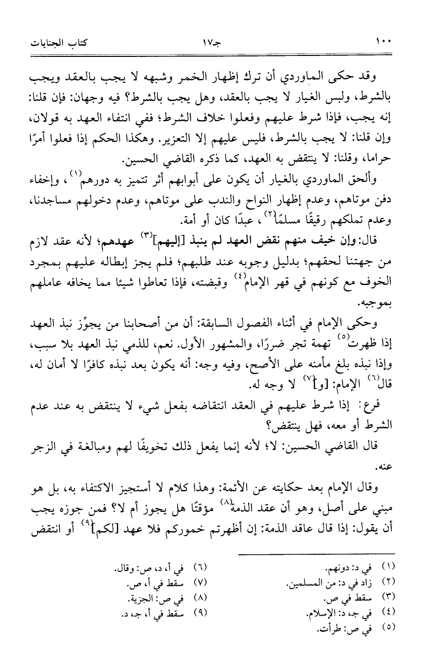 وقد حكى الماوردي أن ترك إظهار الخمر وشبهه لا يجب بالعقد ويجب بالشرط، ولبس الغيار لا يجب بالعقد، وهل يجب الشرط؟ فيه وجهان: فإن قلنا: إنه يجب، فإذا شرط عليهم وفعلوا خلاف الشرط؛ ففي انتفاء العهد به قولان، وإن قلنا: لا يجب بالشرط، فليس عليهم إلا التعزيز. وهكذا الحكم إذا فعلوا أمرا حراما، وقلنا: لا ينتقض به العهد، كما ذكره القاضي الحسين.