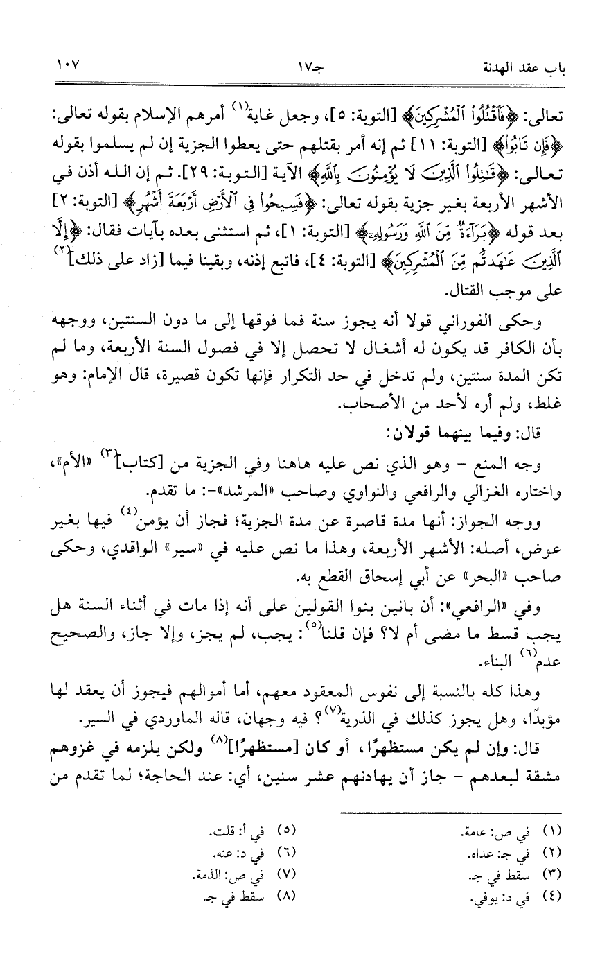 تعالى: {فَاقْتُلُوا الْمُشْرِكِينَ} [التوبة: 5]، وجعل غاية أمرهم الإسلام بقوله تعالى: {فَإِنْ تَابُوا} [التوبة: 11] ثم إنه أمر بقتلهم حتى يعطلوا الجزية إن لم يسلموا بقوله تعالى: {قَاتِلُوا الَّذِينَ لَا يُؤْمِنُونَ بِاللَّهِ} الآية [التوبة: 29]. ثم إن الله أذن في الأشهر الأربعة بغير جزية بقوله تعالى: {فَسِيحُوا فِي الْأَرْضِ أَرْبَعَةَ} [التوبة: 2] بعد قوله {بَرَاءَةٌ مِنَ اللَّهِ وَرَسُولِهِ} [التوبة: 1]، ثم استثنى بعده بآيات فقال: {إِلَّا الَّذِينَ عَاهَدْتُمْ مِنَ الْمُشْرِكِينَ} [التوبة: 4]، فاتبع إذنه، وبقينا فيما [زاد على ذلك] على موجب القتال.