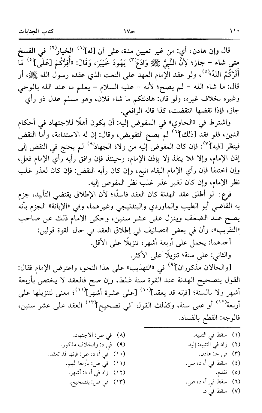 [والحالان مذكوران] في "التهذيب" على هذا النحو، واعترض الإمام فقال: القول بتصحيح الهدنة عند القوة سنة غلط، وإن صح فالعقد لا يختص بأربعة أشهر ولا بالسنة؛ [فإنه قد يعقد] [على عشرة أشهر]؛ معنى لتنزيلها على أربعة أو على سنة، وكذلك القول [في تصحيح] العقد على عشر سنين، فالوجه: القطع بالفساد.