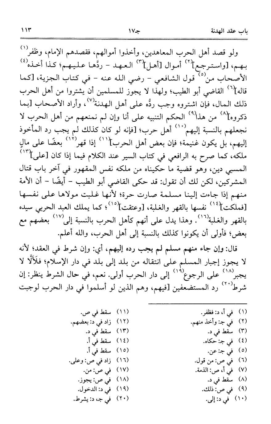 ولو قصد أهل الحرب المعاهدين، وأخذوا أموالهم، فقصدهم الإمام، وظفر بهم، [واسترجع] أموال [أهل] العهد – ردها عليهم؛ كذا أخذه الأصحاب من قول الشافعي – رضي الله عنه – في كتاب الجزية، [كما قاله] القاضي أبو الطيب؛ ولهذا لا يجوز للمسلمين أن يشتروا من أهل الحرب ذلك المال، فإن اشتروه وجب رده على أهل الهدنة، وأراد الأصحاب [بما ذكروه] من هذا الحكم التنبيه على أنا وإن لم نمنعهم من أهل الحرب لا نجلهم بالنسبة إليهم أهل حرب؛ [فإنه لو كان كذلك لم يجب رد المأخوذ إليهم، بل يكون غنيمة؛ فإن بعض أهل الحرب] إذا قهر بعضا على مال ملكه، كما صرح به الرافعي في كتاب السير عند الكلام فيما إذا كان [على] المسبي دين، وهو قضية ما حكيناه من ملكه نفس المقهور في آخر باب قتال المشركين، لكن لك أن تقول: قد حكى القاضي أبو الطيب – أيضا – أن الأمة منهم إذا جاءت إلينا مسلمة صارت حرة؛ لأنها غلبت مولاها على نفسها [فملكت] نفسها بالقهر والغلبة، [وعتقت]؛ كما يملك العبد الحربي سيده بالقهر والغلبة. وهذا يدل على أنهم كأهل الحرب بالنسبة إلى بعضهم مع بعض؛ فأولى أن يكونوا كذلك بالنسبة إلى أهل الحرب، والله أعلم.