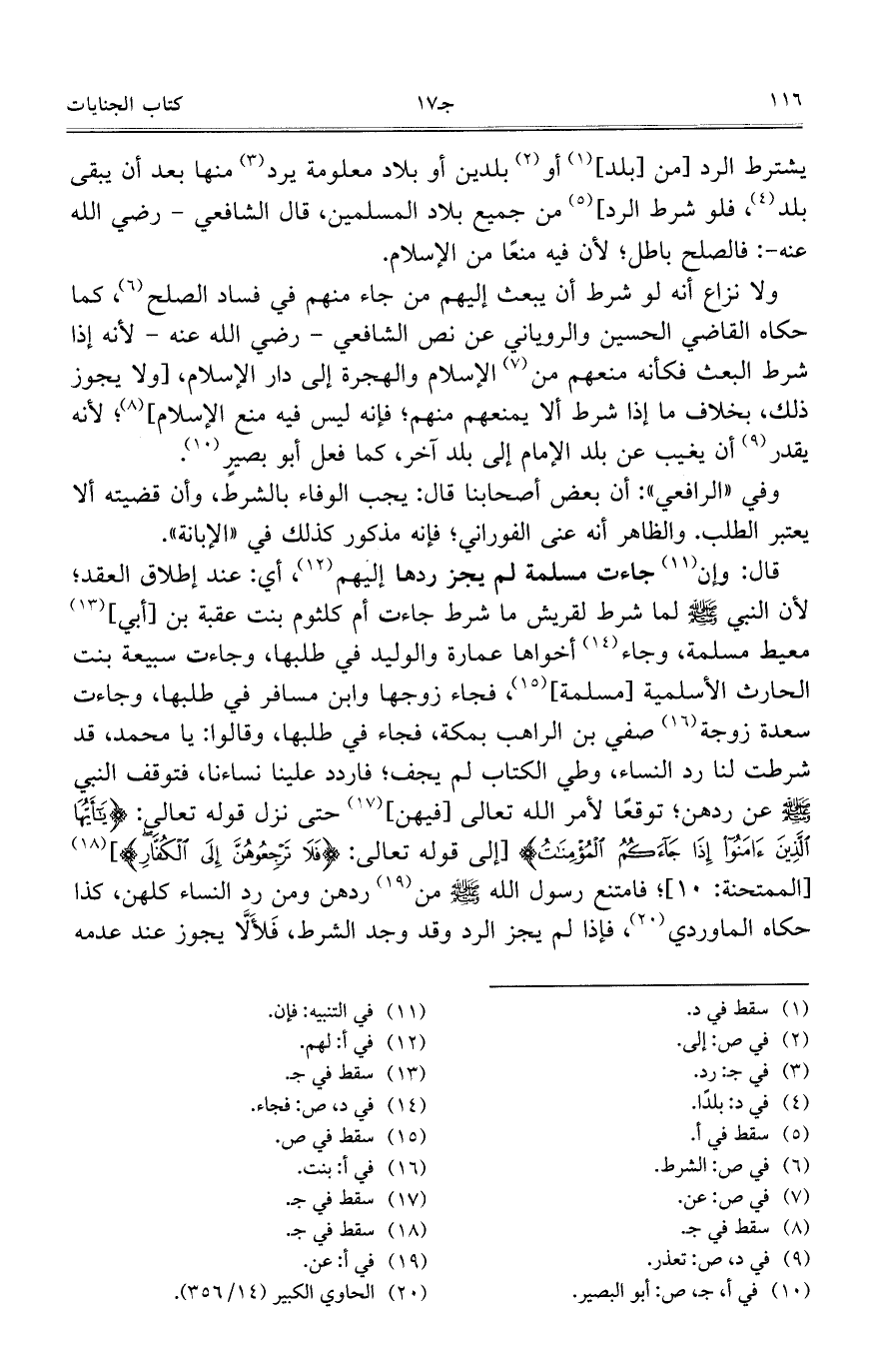 يشترط الرد [من [بلد] أو بلدين أو بلاد معلومة يرد منها بعد أن يبقى بلد، فلو شرط الرد] من جميع بلاد المسلمين، قال الشافعي – رضي الله عنه -: فالصلح باطل؛ لأن فيه منعا من الإسلام.