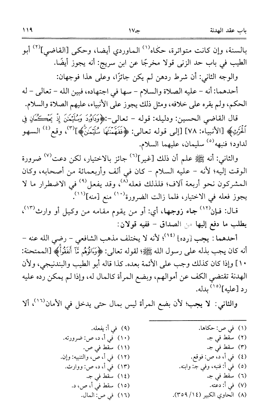 قال القاضي الحسين: ودليله: قوله – تعالى - {وَدَاوُودَ وَسُلَيْمَانَ إِذْ يَحْكُمَانِ فِي الْحَرْثِ} [الأنبياء: 78] [إلى قوله تعالى: {فَفَهَّمْنَاهَا سُلَيْمَانَ}]، وقع السهو لداود؛ فنبهه سليمان، عليهما السلام.