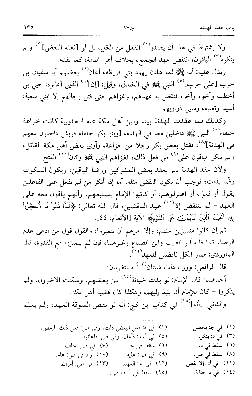 ولأن عقد الهدنة يتم بعقد بعض المشركين ورضا الباقين، ويكون السكوت رضا بذلك؛ فوجب أن يكون النقض مثله. أما إذا أنكر من لم يفعل على الفاعلين بقول أو فعل، أو اعتزلوهم، أو كاتبوا الإمام بصنيعهم، وأنهم باقون معه على العهد – لم ينتقض إلا عهد الناقضين؛ قال الله تعالى: {فَلَمَّا نَسُوا مَا ذُكِّرُوا بِهِ أَنْجَيْنَا الَّذِينَ يَنْهَوْنَ عَنِ السُّوءِ} الآية [الأنعام: 44].