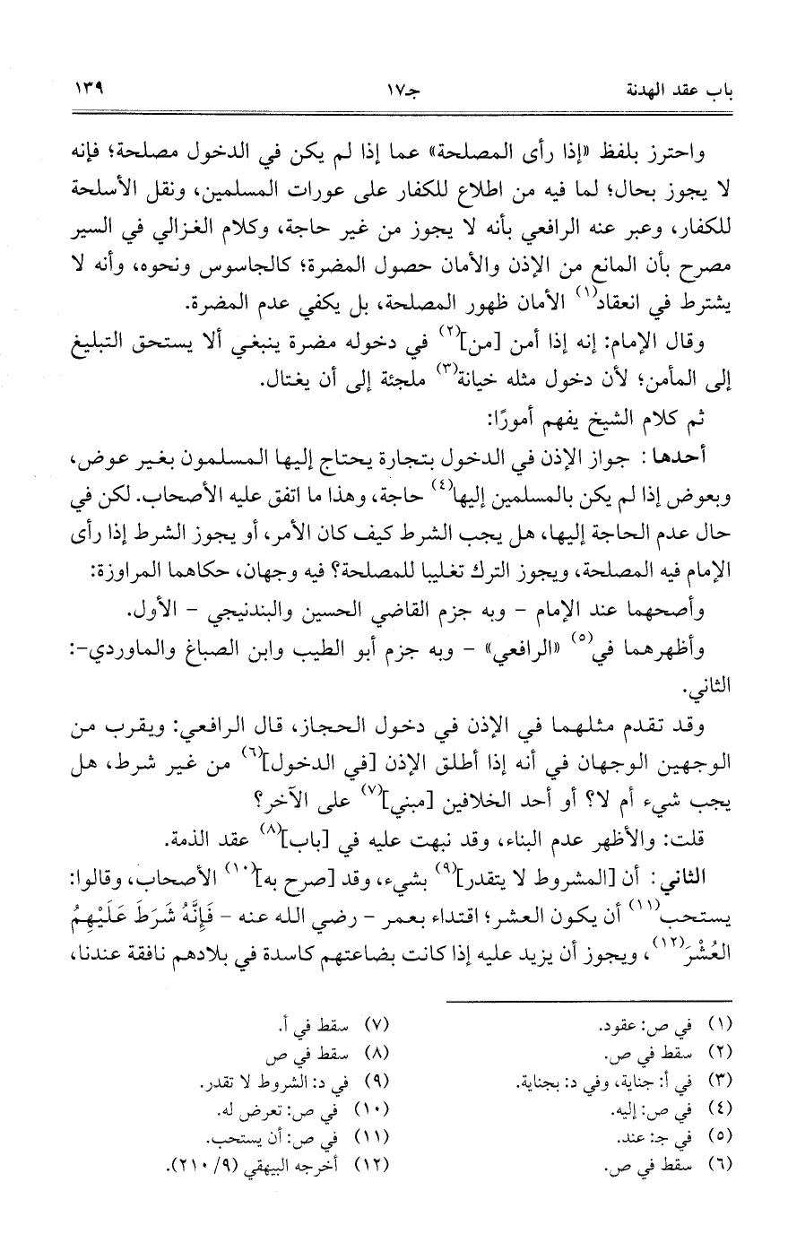 أحدها: جواز الإذن في الدخول بتجارة يحتاج إليها المسلمون بغير عوض، وبعوض إذا لم يكن بالمسلمين إليها حاجة، وهذا ما اتفق عليه الأصحاب. لكن في حال عدم الحاجة إليها، هل يجب الشرط كيف كان الأمر، أو يجوز الشرط إذا رأى الإمام فيه المصلحة، ويجوز الترك تغليبا للمصلحة؟ فيه وجهان، حكاهما المراوزة: