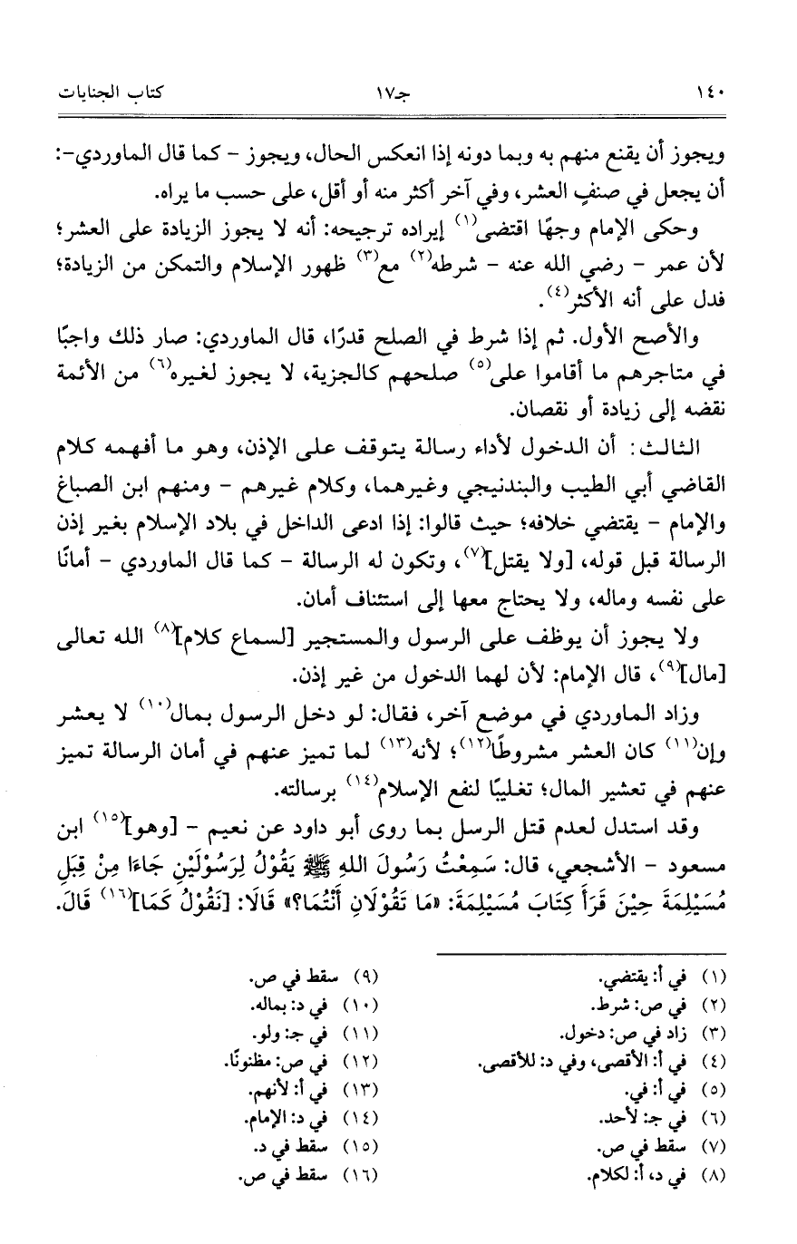 وحكى الإمام وجها اقتضى إيراده ترجيحه: أنه لا يجوز الزيادة على العشر؛ لأن عمر – رضي الله عنه – شرطه مع ظهور الإسلام والتمكن من الزيادة؛ فدل على أنه الأكثر.