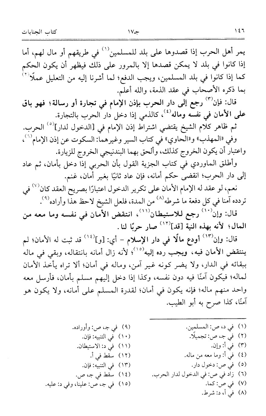 يمر أهل الحرب إذا قصدوها على بلد للمسلمين في طريقهم أو مال لهم، أما إذا كانوا في بلد لا يمكن قصدها إلا بالمرور على ذلك فيظهر أن يكون الحكم كما إذا كانوا في بلد المسلمين، ويجب الدفع؛ لما أشرنا إليه من التعليل عملا بما ذكره الأصحاب في عقد الذمة، والله أعلم.