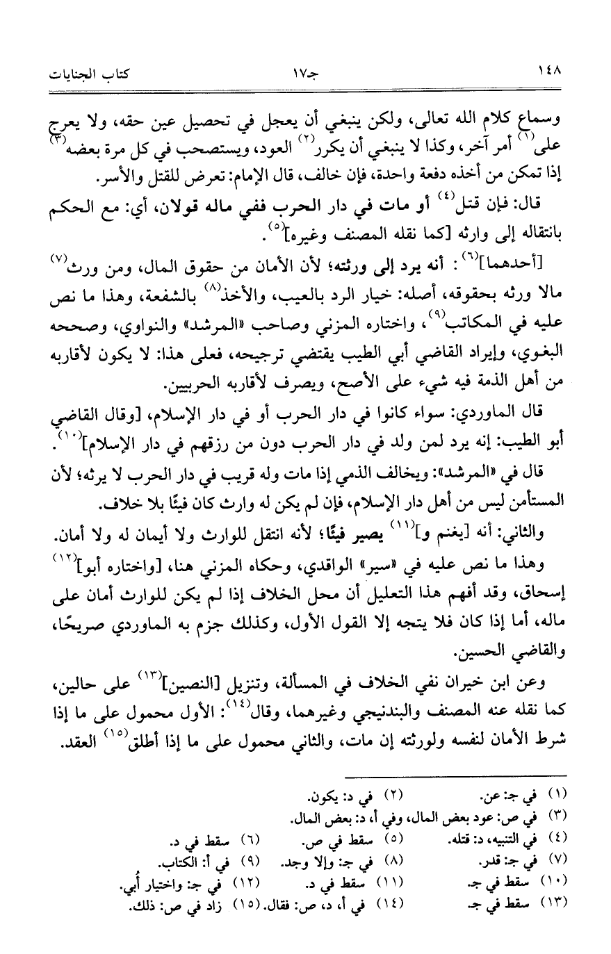 وهذا ما نص عليه في "سير" الواقدي، وحكاه المزني هنا، [واختاره أبو [إسحاق، وقد أفهم هذا التعليل أن محل الخلاف إذا لم يكن للوارث أمان على ماله، أما إذا كان فلا يتجه إلا القول الأول، وكذلك جزم به الماوردي صريحا، والقاضي الحسين.