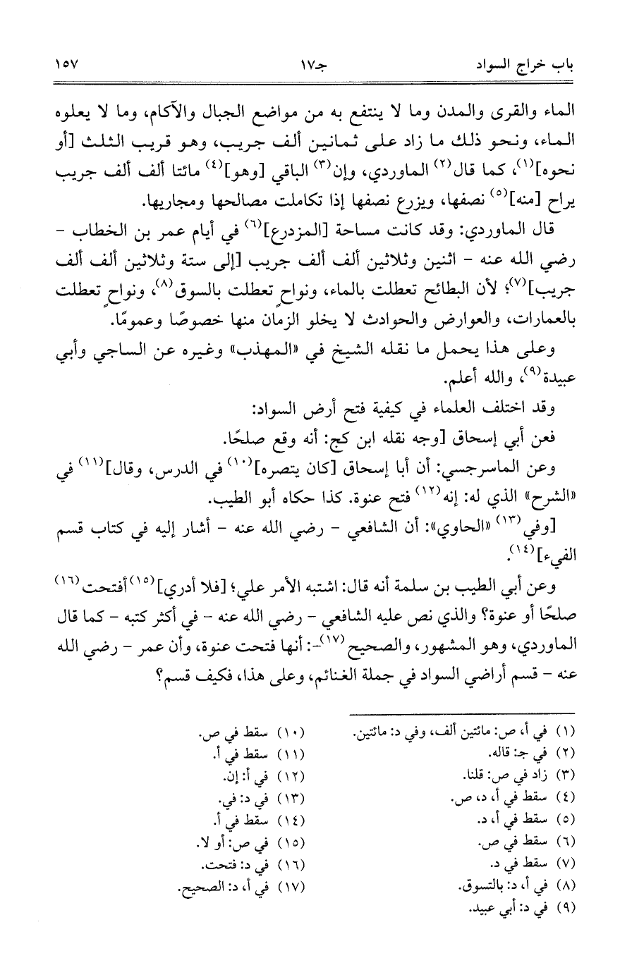 قال الماوردي: وقد كانت مساحة [المزدرع] في أيام عمر بن الخطاب – رضي الله عنه – اثنين وثلاثين ألف ألف جريب [إلى ستة وثلاثين ألف ألف جريب]؛ لأن البطائح تعطلت بالماء، ونواح تعطلت بالسوق، ونواح تعطلت بالعمارات، والعوارض والحوادث لا يخلو الزمان منها خصوصا وعموما.