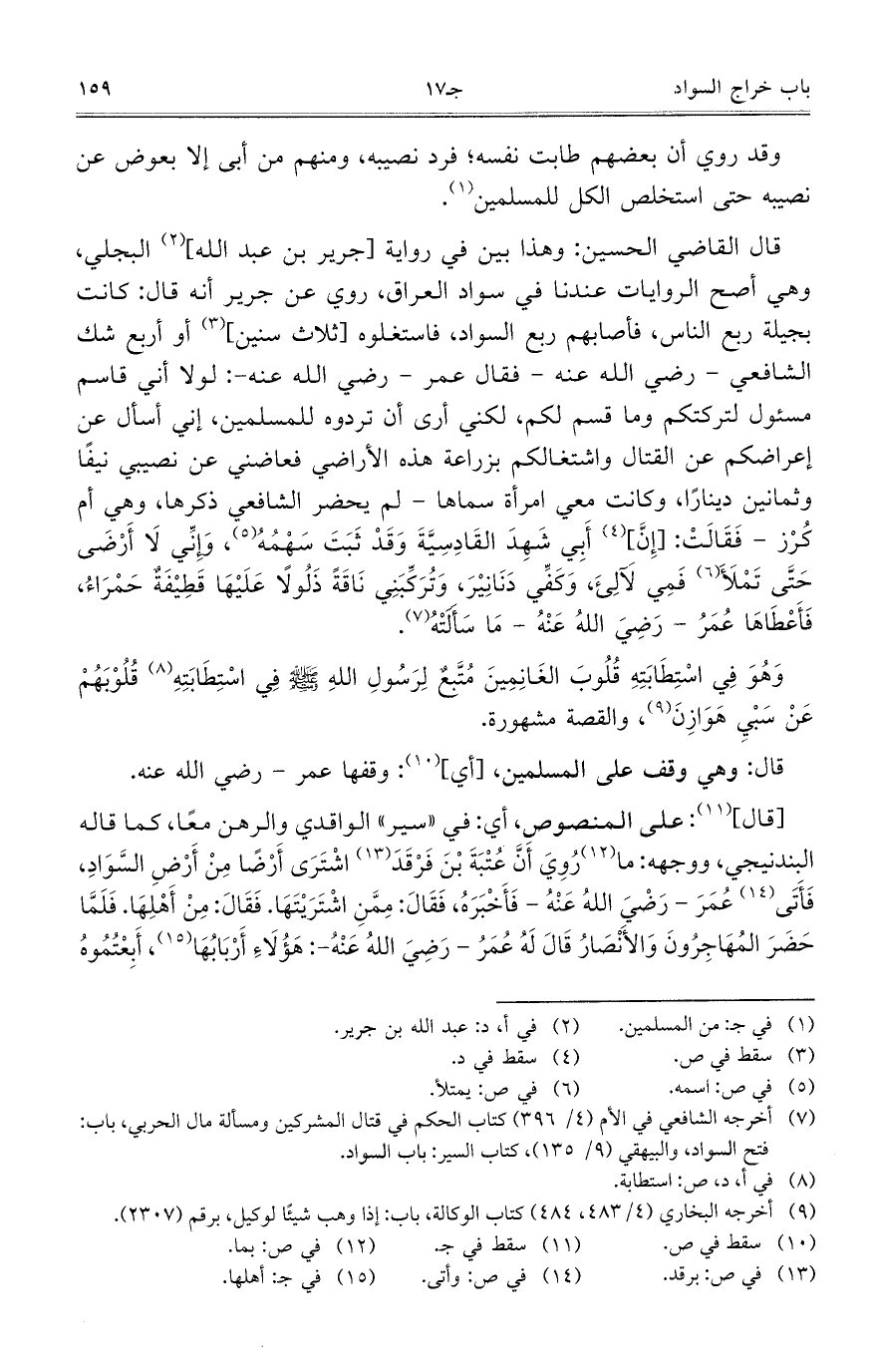 قال القاضي الحسين: وهذا بين في رواية [جرير بن عبد الله] البجلي، وهي أصح الروايات عندنا في سواد العراق، روي عن جرير أنه قال: كانت بجيلة ربع الناس، فأصابهم ربع السواد، فاستغلوه [ثلاث سنين] أو أربع شك الشافعي – رضي الله عنه – فقال عمر – رضي الله عنه -: لولا أني قاسم مسئول لتركتكم وما قسم لكم، لكني أرى أن تردوه للمسلمين، إني أسأل عن إعراضكم عن القتال واشتغالكم بزراعة هذه الأراضي فعاضني عن نصيبي نيفا وثمانين دينارا، وكانت معي امرأة سماها – لم يحضر الشافعي ذكرها، وهي أم كرز – فقالت [إن] أبي شهد القادسية وقد ثبت سهمه، وإني لا أرضى حتى تملأ فمي لآلئ، وكفي دنانير، وتركبني ناقة ذلولا عليها قطيفة حمراء، فأعطاها عمر – رضي الله عنه – ما سألته.