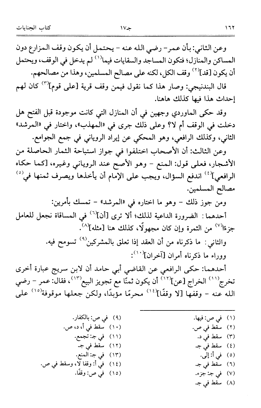 وعن الثاني: بأن عمر – رضي الله عنه – يحتمل أن يكون وقف المزارع دون المساكن والمنازل؛ فتكون المساجد والسقايات فيما لم يدخل في الوقف، ويحتمل أن يكون [قد] وقف الكل، لكنه على مصالح المسلمين، وهذا من مصالحهم.