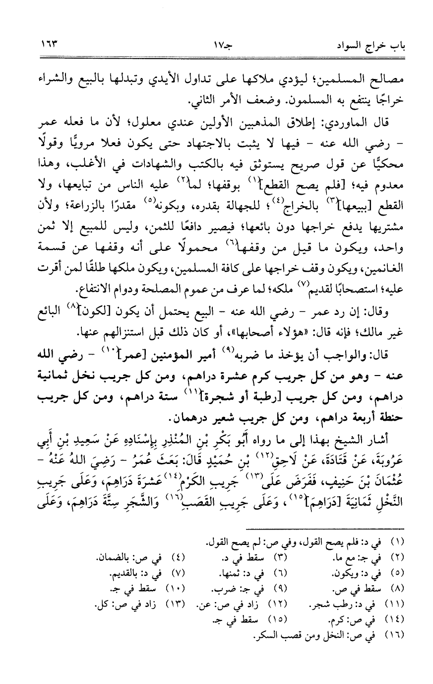 قال: والواجب أن يؤخذ ما ضربه أمير المؤمنين [عمر]- رضي الله عنه – وهو من كل جريب كرم عشرة دراهم، ومن كل جريب نخل ثمانية دراهم، ومن كل جريب [رطبة أو شجرة] ستة دراهم، ومن كل جريب حنطة أربعة دراهم، ومن كل جريب شعير درهمان.