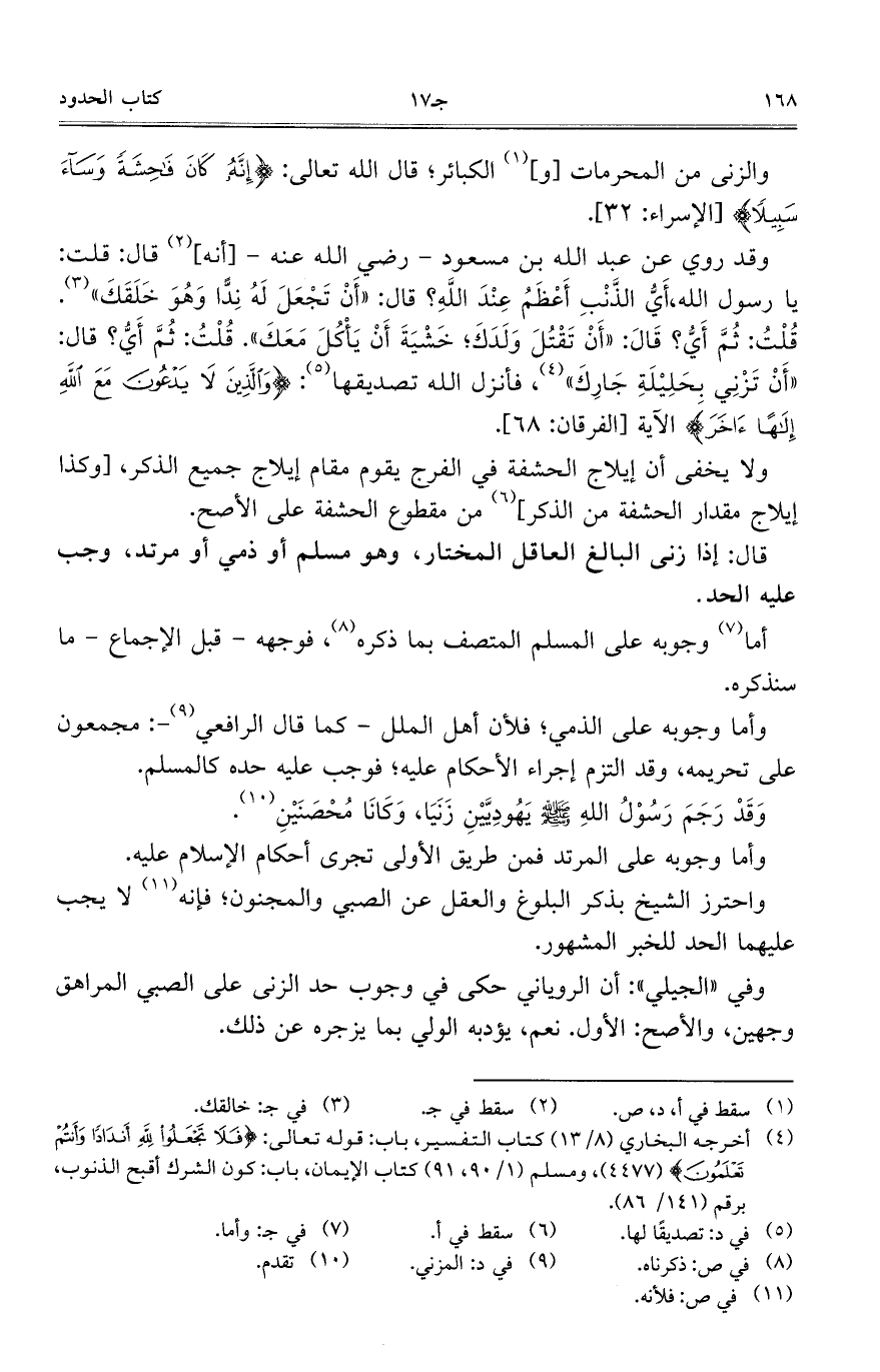 قال: إذا زنى البالغ العاقل المختار، وهو مسلم أو ذمي أو مرتد، وجب عليه الحد.
