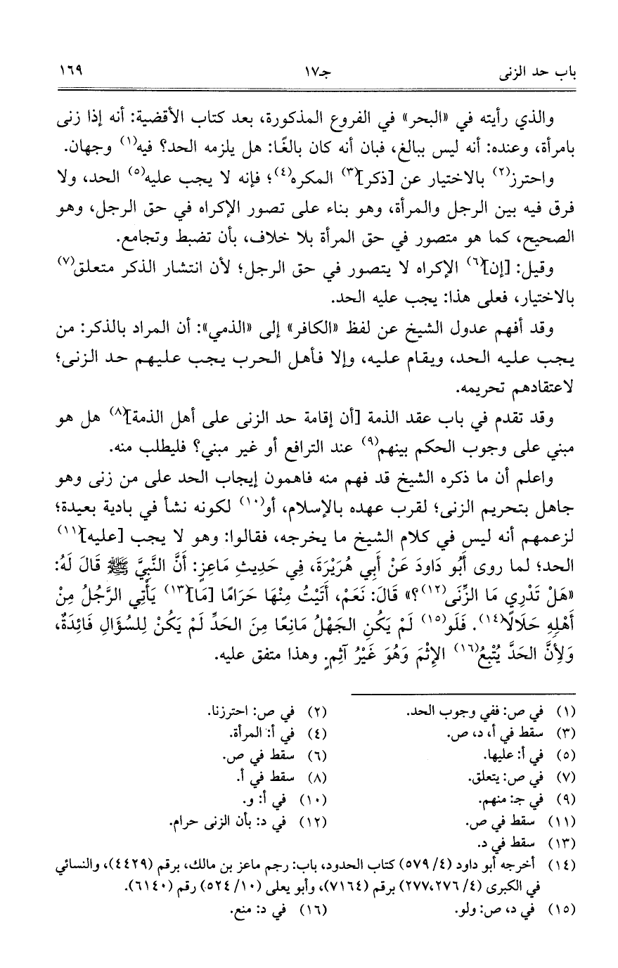 واعلم أن ما ذكره الشيخ قد فهم منه فاهمون إيجاب الحد على من زنى وهو جاهل بتحريم الزنى؛ لقرب عهده بالإسلام، أو لكونه نشأ في بادية بعيدة، لزعمهم أنه ليس في كلام الشيخ ما يخرجه، فقالوا: وهو لا يجب [عليه] الحد؛ لما روى أبو داود عن أبي هريرة، في حديث ماعز: أن النبي صلى الله عليه وسلم قال له: "هل تدري ما الزنى؟ " قال: نعم، أتيت منها حراما [ما] يأتي الرجل من أهله حلالا. فلو لم يكن الجهل مانعا من الحد لم يكن للسؤال فائدة، ولأن الحد يتبع الإثم وهو غير آثم. وهذا متفق عليه.