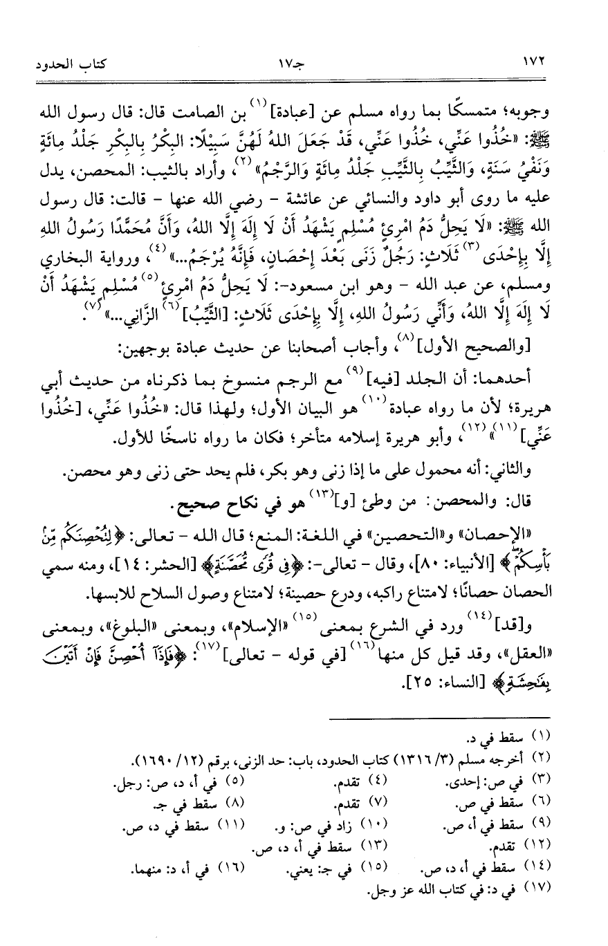وجوبه؛ متمسكا بما رواه مسلم عن [عبادة] بن الصامت قال: قال رسول الله صلى الله عليه وسلم: "خذوا عني، خذوا عني، قد جعل الله لهن سبيلا: البكر بالبكر جلد مائة ونفي سنة، والثيب بالثيب جلد مائة والرجم"، وأراد بالثيب: المحصن، يدل عليه ما روى أبو داود والنسائي عن عائشة – رضي الله عنها – قالت: قال رسول الله صلى الله عليه وسلم: "لا يحل دم امرئ مسلم يشهد أن لا إله إلا الله، وأن محمدا رسول الله إلا بإحدى ثلاث: رجل زنى بعد إحصان، فإنه يرجم ... "، ورواية البخاري ومسلم، عن عبد الله – وهو ابن مسعود -: لا يحل دم امرئ مسلم يشهد أن لا إله إلا الله، وأني رسول الله، إلا بإحدى ثلاث: [الثيب] الزاني ... ".
