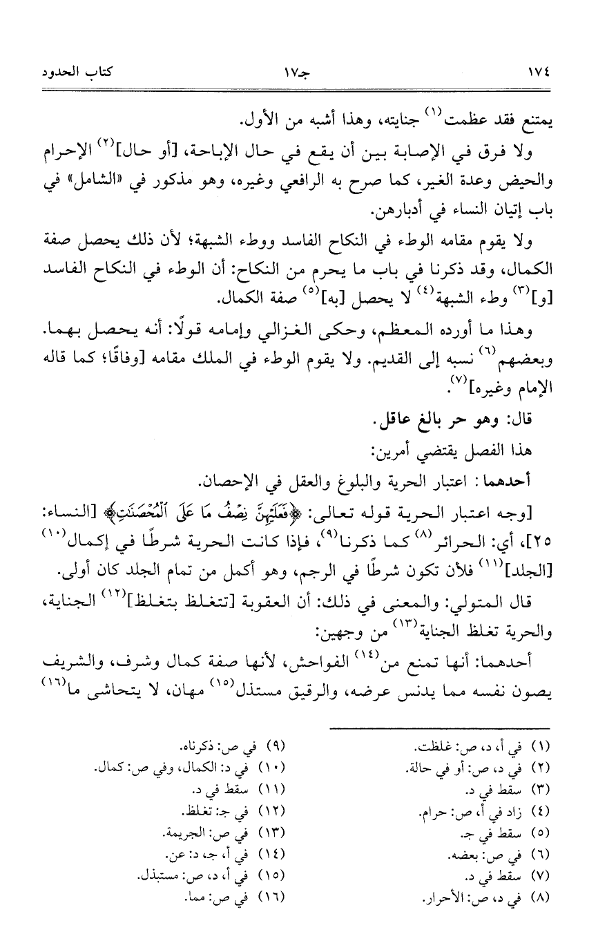 أحدهما: اعتبار الحرية والبلوغ والعقل في الإحصان.