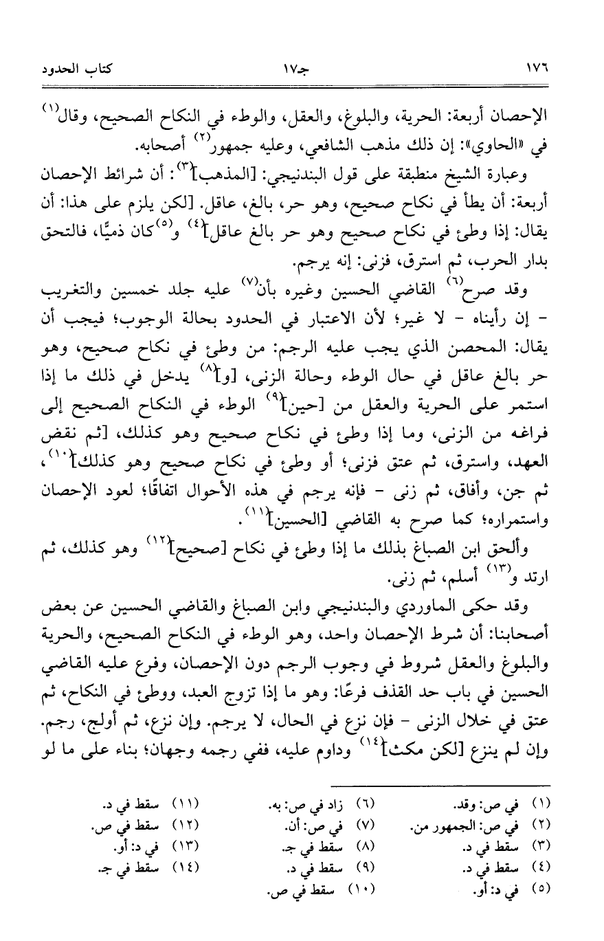 وقد صرح القاضي الحسين وغيره بأن عليه جلد خمسين والتغريب – إن رأيناه – لا غير؛ لأن الاعتبار في الحدود بحالة الوجوب؛ فيجب أن يقال: المحصن الذي يجب عليه الرجم: من وطئ في نكاح صحيح، وهو حر بالغ عاقل في حال الوطء وحالة الزنى، [و] يدخل في ذلك ما إذا استمر على الحرية والعقل من [حين] الوطء في النكاح الصحيح إلى فراغه من الزنى، وما إذا وطئ في نكاح صحيح وهو كذلك، [ثم نقض العهد، واسترق، ثم عتق فزنى؛ أو وطئ في نكاح صحيح وهو كذلك]، ثم جن، وأفاق، ثم زنى – فإنه يرجم في هذه الأحوال اتفاقا؛ لعود الإحصان واستمراره؛ كما صرح به القاضي [الحسين].