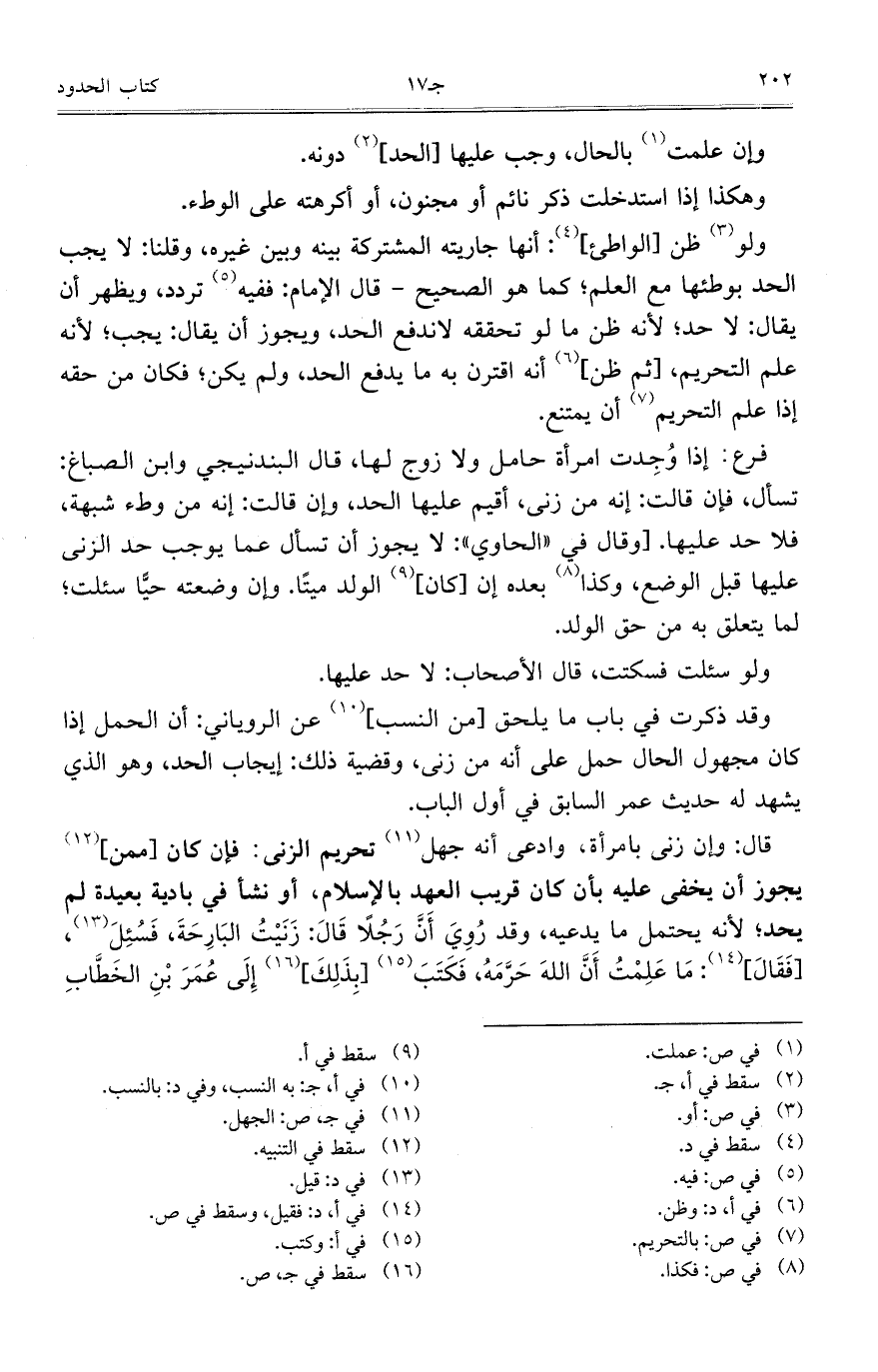 قال: وإن زنى بامرأة، وادعى أنه جهل تحريم الزنى: فإن كان [ممن] يجوز أن يخفى عليه بأن كان قريب العهد بالإسلام، أو نشأ في بادية بعيدة لم يحد؛ لأنه يحتمل ما يدعيه، وقد روي أن رجلا قال: زنيت البارحة، فسئل، [فقال]: ما علمت أن الله حرمه، فكتب [بذلك] إلى عمر بن الخطاب