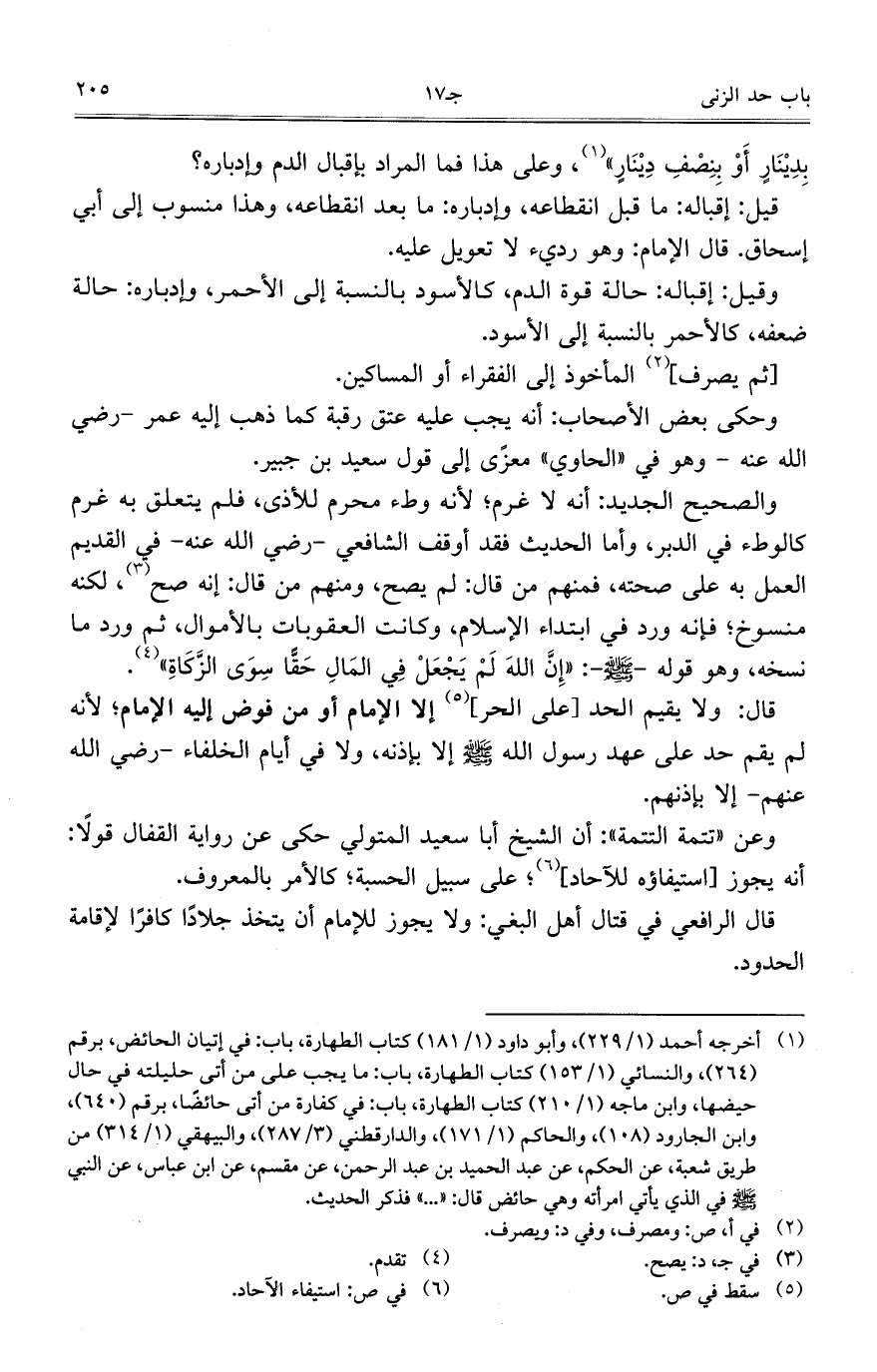 والصحيح الجديد: أنه لا غرم؛ لأنه وطء محرم للأذى، فلم يتعلق به غرم كالوطء في الدبر، وأما الحديث فقد أوقف الشافعي – رضي الله عنه – في القديم العمل به على صحته، فمنهم من قال: لم يصح، ومنهم من قال: إنه صح، لكنه منسوخ؛ فإنه ورد في ابتداء الإسلام، وكانت العقوبات بالأموال، ثم ورد ما نسخه، وهو قوله - صلى الله عليه وسلم -: "إن الله لم يجعل في المال حقا سوى الزكاة".