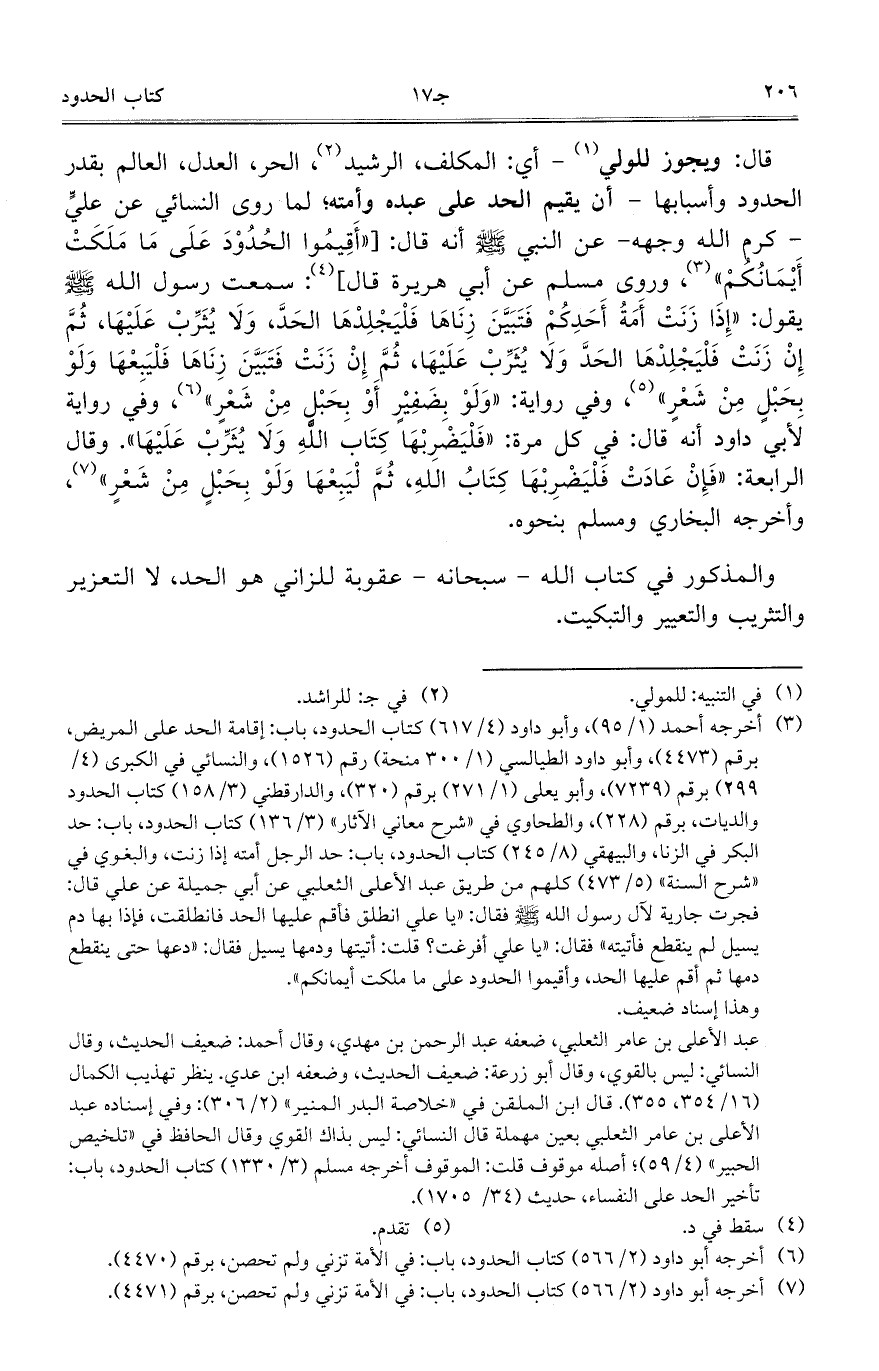 قال: ويجوز للولي – أي: المكلف، الرشيد، الحر، العدل، العالم بقدر الحدود وأسبابها – أن يقيم الحد على عبده وأمته؛ لما روى النسائي عن علي – كرم الله وجهه – عن النبي صلى الله عليه وسلم أنه قال: ["أقيموا الحدود على ما ملكت أيمانكم"، وروى مسلم عن أبي هريرة قال]: سمعت رسول الله صلى الله عليه وسلم يقول: "إذا زنت أمة أحدكم فتبين زناها فليجلدها الحد، ولا يثرب عليها، ثم إن زنت فليجلدها الحد ولا يثرب عليها، ثم إن زنت فتبين زناها فليبعها ولو بحبل من شعر"، وفي رواية: "ولو بضفير أو بحبل من شعر"، وفي رواية لأبي داود أنه قال: في كل مرة: "فليضربها كتاب الله ولا يثرب عليها". وقال الرابعة: "فإن عادت فليضربها كتاب الله، ثم ليبعها ولو بحبل من شعر"، وأخرجه البخاري ومسلم بنحوه.