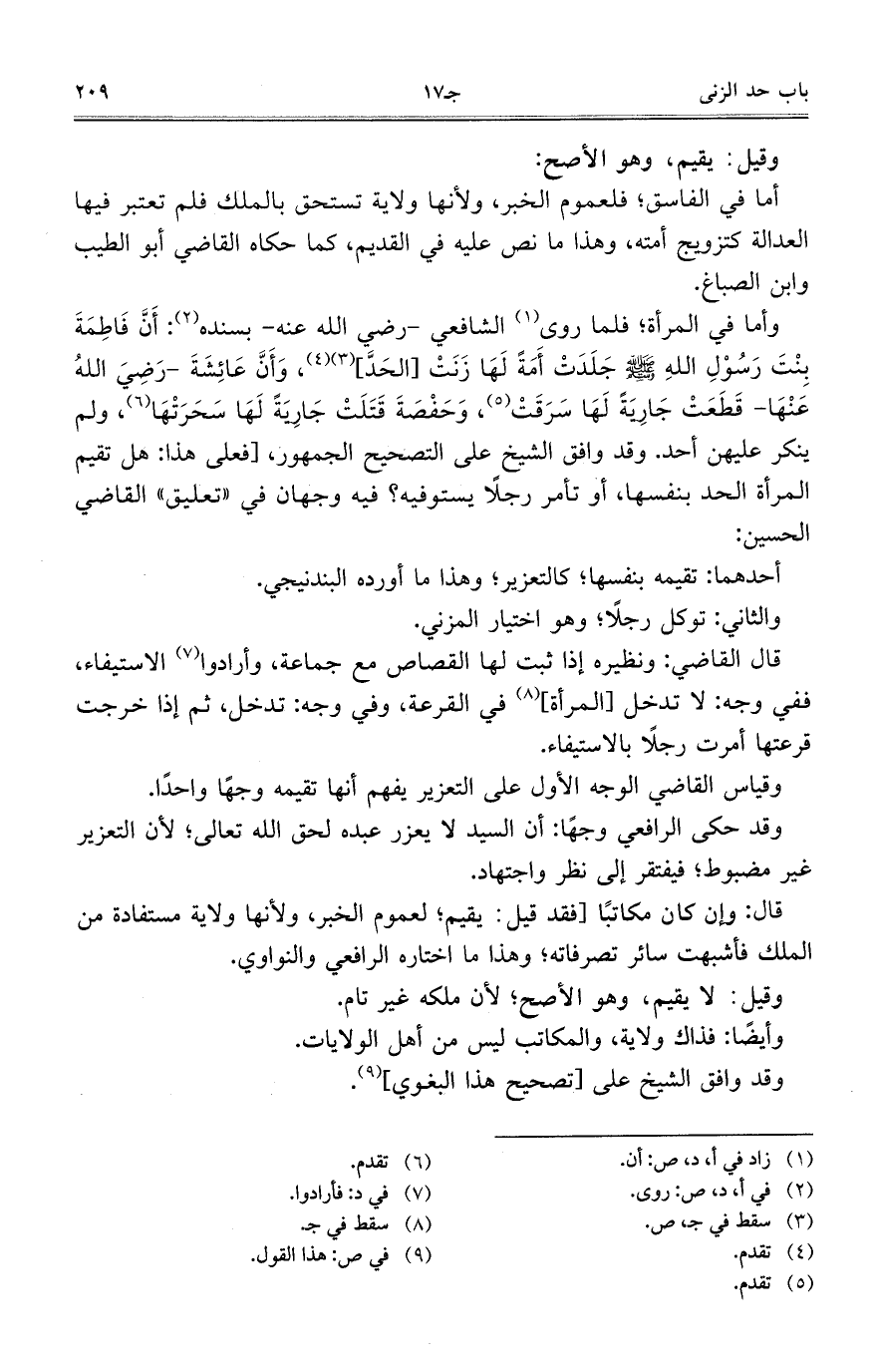 وأما في المرأة؛ فلما روى الشافعي – رضي الله عنه – بسنده: أن فاطمة بنت رسول الله صلى الله عليه وسلم جلدت أمة لها زنت [الحد]، وأن عائشة – رضي الله عنها – قطعت جارية لها سرقت، وحفصة قتلت جارية لها سحرتها، ولم ينكر عليهن أحد. وقد وافق الشيخ على التصحيح الجمهور، [فعلى هذا: هل تقيم المرأة الحد بنفسها، أو تأمر رجلا يستوفيه؟ فيه وجهان في "تعليق" القاضي الحسين: