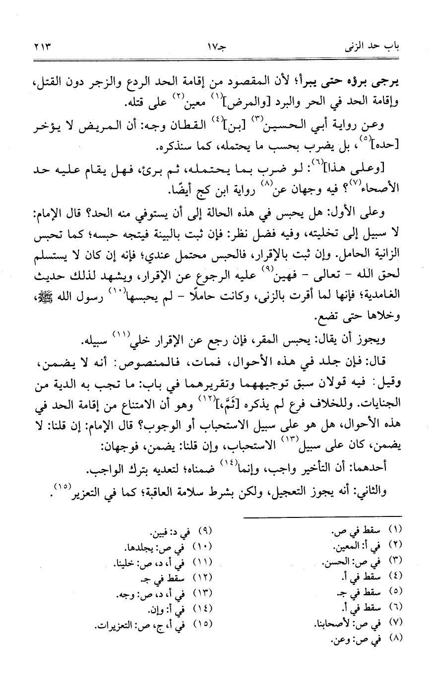 وعلى الأول: هل يحبس في هذه الحالة إلى أن يستوفي منه الحد؟ قال الإمام: لا سبيل إلى تخليته، وفيه فضل نظر: فإن ثبت بالبنية فيتجه حبسه؛ كما تحبس الزانية الحامل. وإن ثبت بالإقرار، فالحبس محتمل عندي؛ فإنه إن كان لا يستسلم لحق الله – تعالى – فهين عليه الرجوع عن الإقرار، ويشهد لذلك حديث الغامدية؛ فإنها لما أقرت بالزنى، وكانت حاملا – لم يحبسها رسول الله ?، وخلاها حتى تضع.