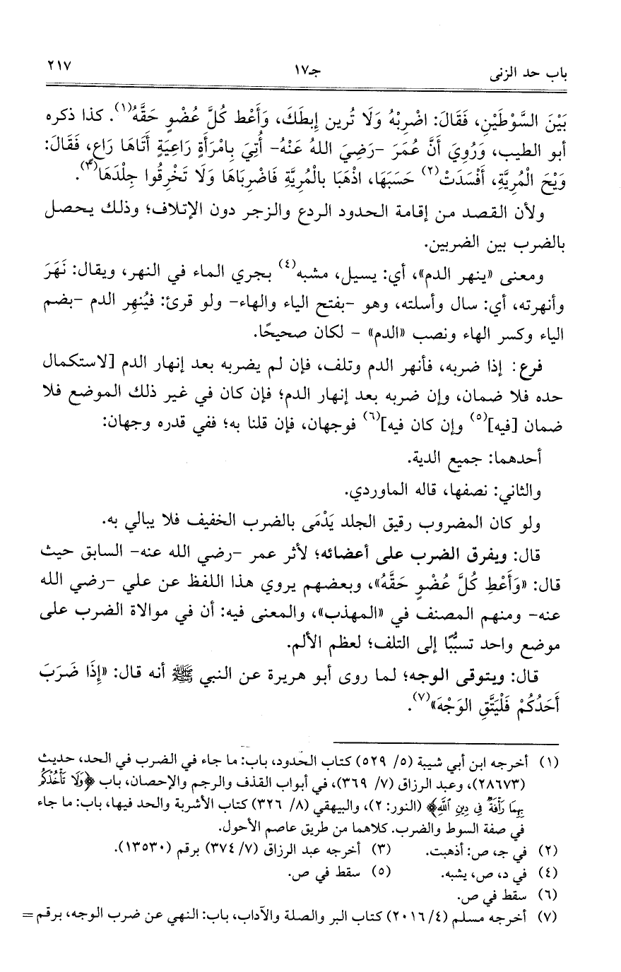بين السوطين، فقال: اضربه ولا ترين إبطك، وأعط كل عضو حقه. كذا ذكره أبو الطيب، وروي أن عمر - رضي الله عنه – أتي بامرأة راعية أتاها راع، فقال: ويح المرية، أفسدت حسبها، اذهبا بالمرية فاضرباها ولا تخرقوا جلدها.