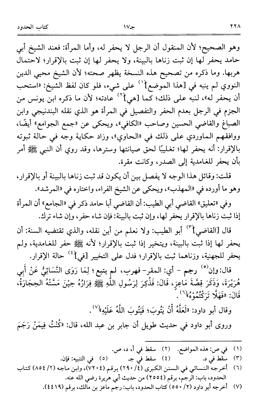قال [القاضي] أبو الطيب: ولا نعلم من أين نقله، والذي تقتضيه السنة: أن يحفر لها إذا ثبت بالبنية، ويتخير إذا ثبت بالإقرار؛ لأنه صلى الله عليه وسلم حفر للغامدية، ولم يحفر للجهنية، وزناهما ثبت بالإقرار؛ فدل على التخيير [في] حالة الإقرار.