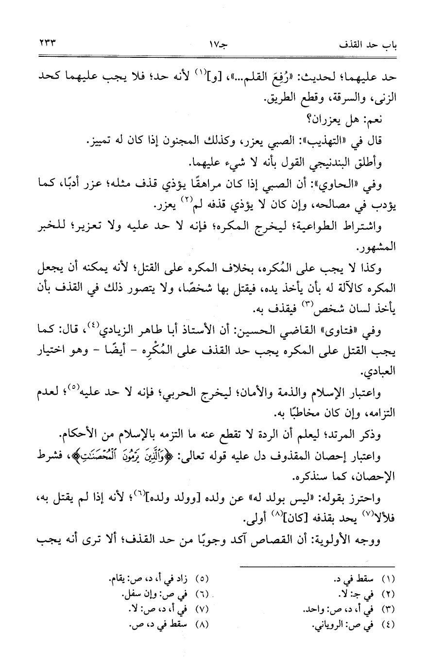 واعتبار الإسلام والذمة والأمان؛ ليخرج الحربي، فإنه لا حد عليه؛ لعدم التزامه، وإن كان مخاطبا به.